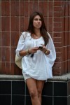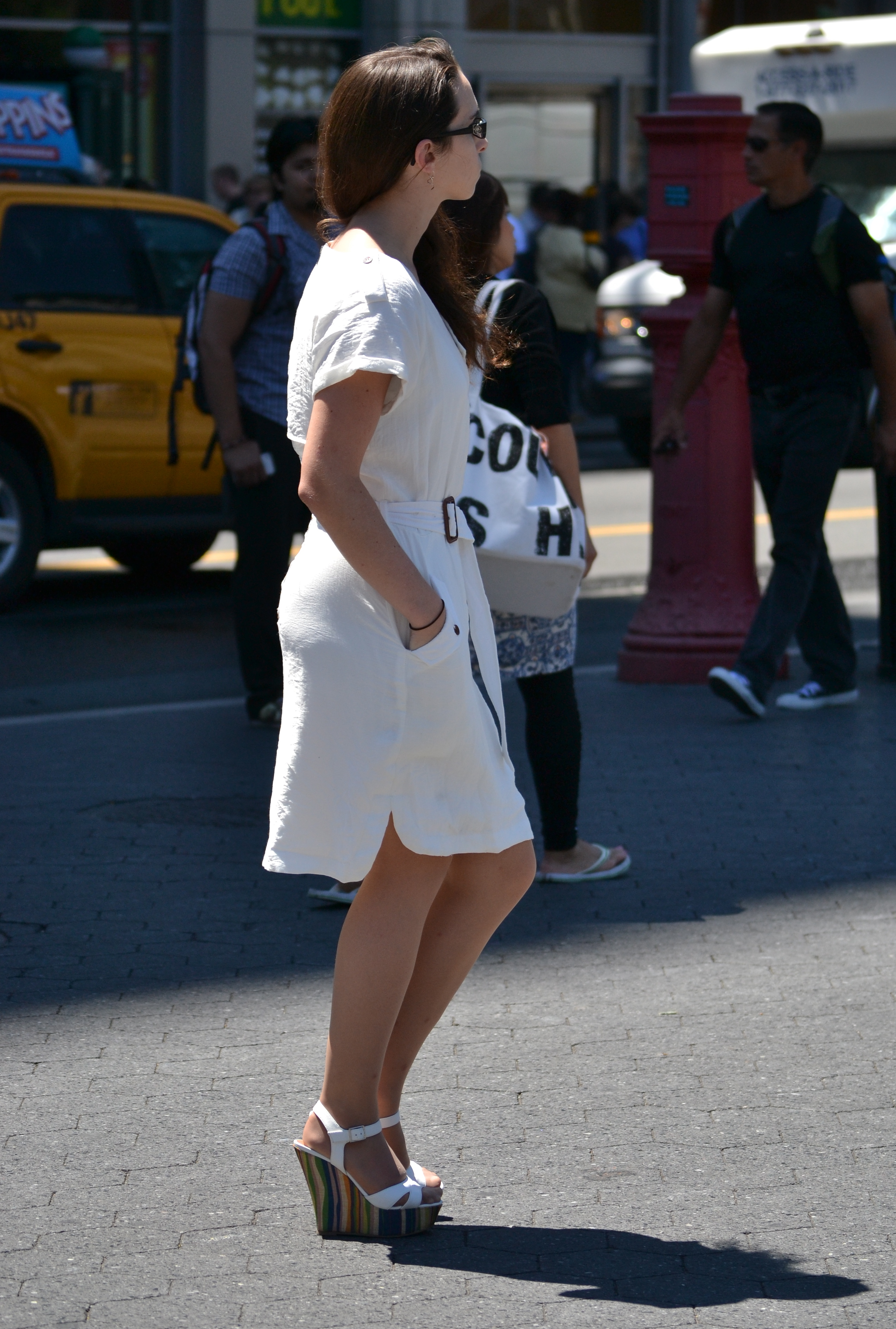 This belted, button front dress is fun and airy. The multicolored platforms on her white sandals are a great accent to the all white ensemble.