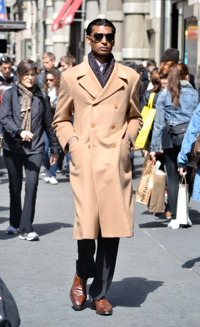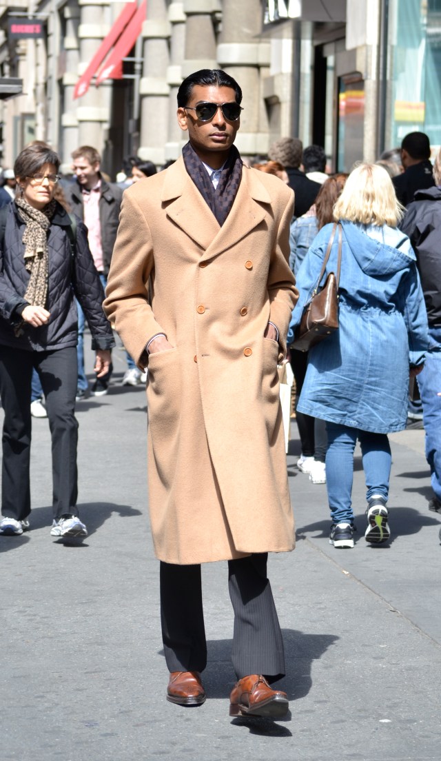 The men's overcoat is a versatile item to have in a wardrobe. Not only does it keep you warm and dry, but it also allows you to wear just about anything underneath. This gentleman wears his camel hair overcoat with black, pinstripe dress pants and brown leather shoes. Around his neck he wears a dark colored, checkered scarf. The rest of him is hidden underneath the long, but very classy coat. The hands in the pockets and dark aviators, creates a very suave appearance.