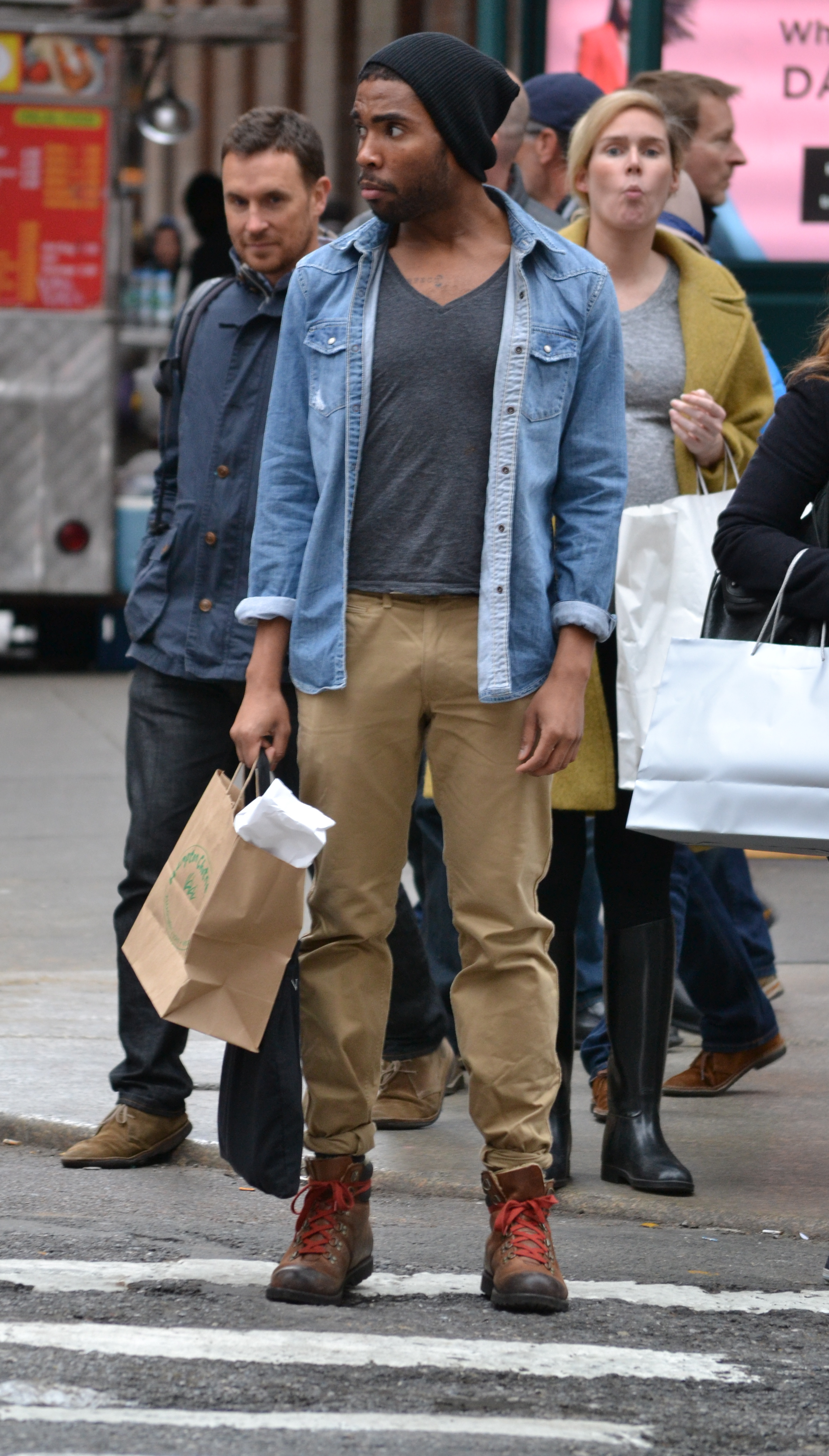 There's no need for a tailor these days. The go-to move instead, is to roll or cuff your clothes. This young man, waiting for a walk sign, does just that. His chinos are rolled up to just above his hiking boots (the red laces are a nice touch). the sleeves on his denim over shirt are rolled, creating a 3/4 length look. Underneath the denim he has a charcoal v-neck which shows a little of his chest tattoo.