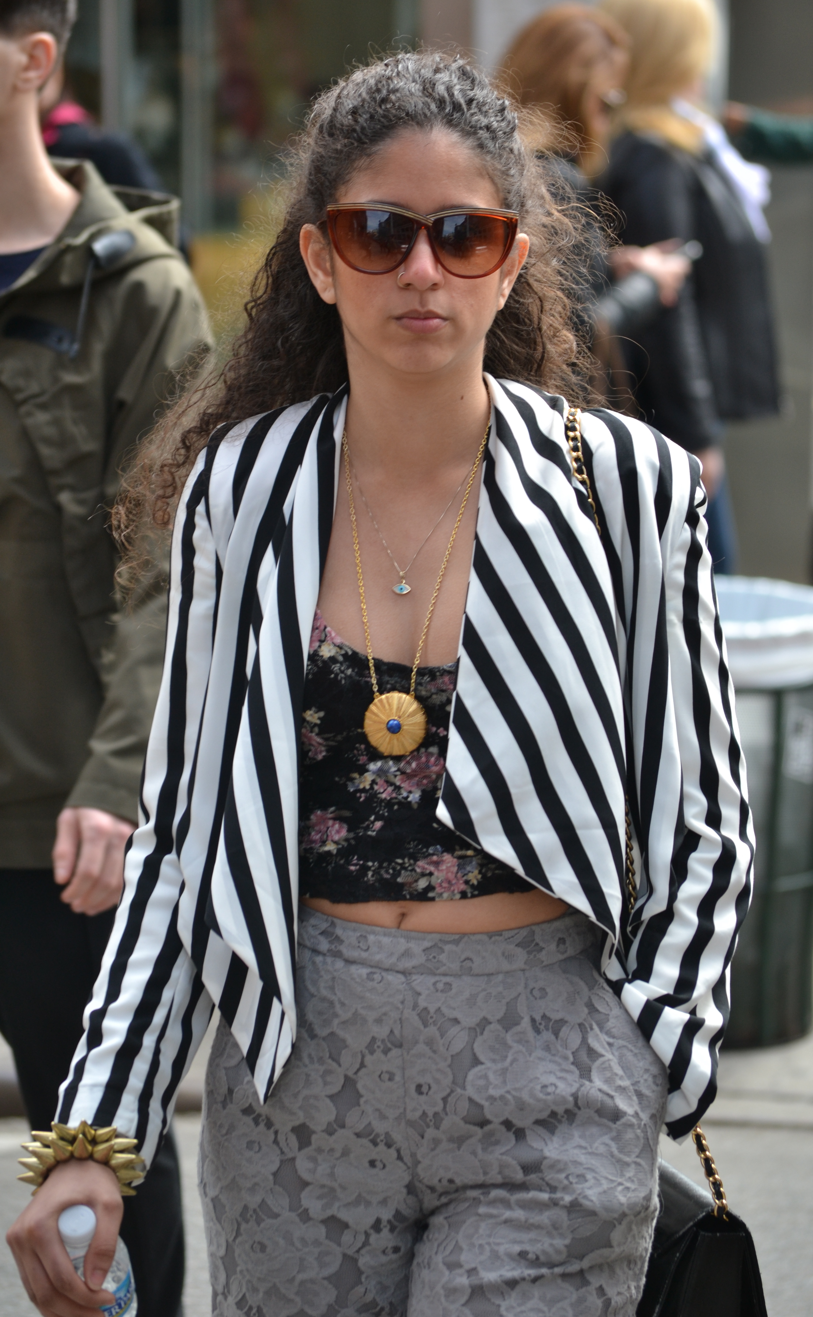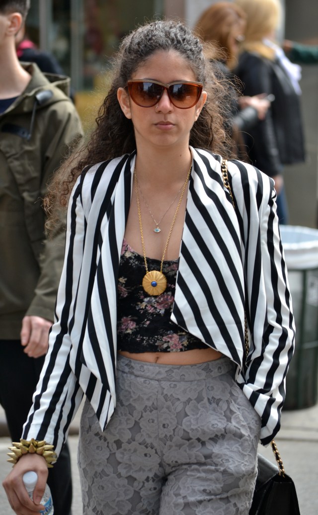 I absolutely love this outfit. From the interplay of colors and patterns, to the skin left exposed, it certainly is a lot to take in, but well worth it. The high waisted, lace capri pants are amazing. They are cut at the right length, as to not interfere with the gold glitter covered shoes. The black floral tank, leaves a small sliver of midriff exposed and its low cut neck shows off a generous amount of skin, without being inappropriate. The black and white striped, wrap jacket adds an intense pattern to the outfit but works well with the other colors.