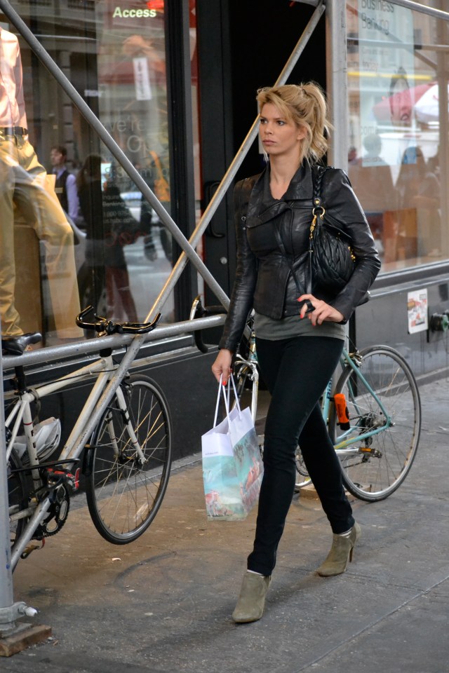 A black outfit is classic, but can also be dull. Layering the ensemble is a great way to add color and texture. This young woman dons a short, black motorcycle jacket, with black skinny jeans. Alone these two items would flat, but a long grey shirt creates a little contrast. The color difference is minimal, but enough to break up the outfit, making it more appealing to the eye (and also accentuating the hips). The beige, suede booties are also a nice addition of color at the base of the black jean.