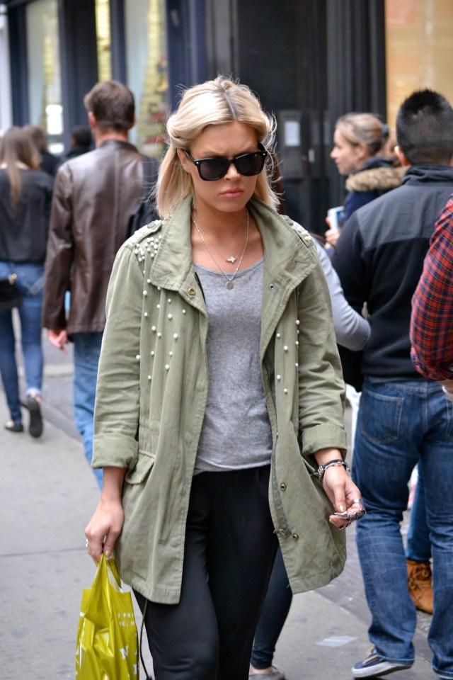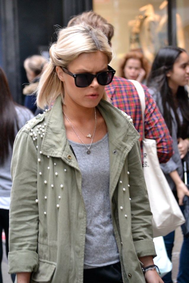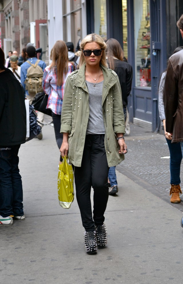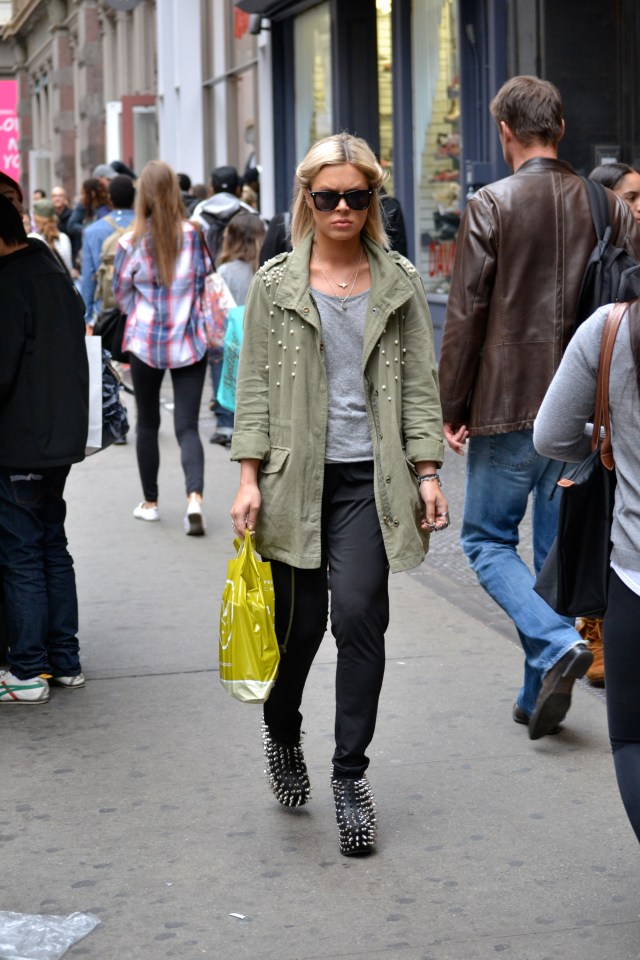 This young woman is wearing only solid color items, but she makes them her own as she styles them accordingly. Her black leggings are loose, not tight like you would usually see. Her shirt is a simple grey scoop neck tee. But here is where it gets interesting. Her black high heel shoes are covered in 3/4 inch conical spikes. Yet, her olive drab (yes, her too) field jacket is adorned with pearls. The additions to this outfit are an undeniably unique touch.