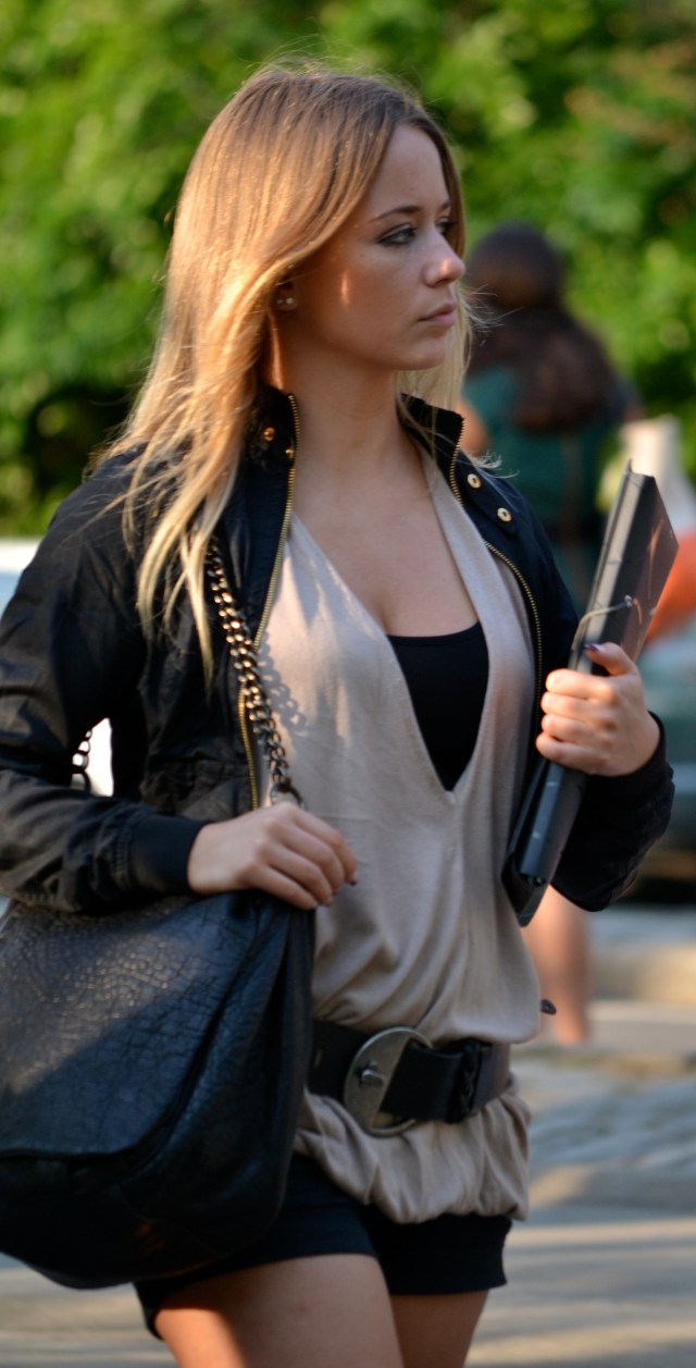 Her black motorcycle jacket ties in with the camisole and shorts, and matches the messenger bag she is carrying on her shoulder. The gold zipper and buttons on the jacket also match the chain strap on her bag.