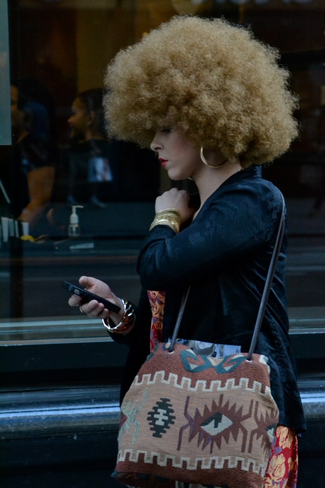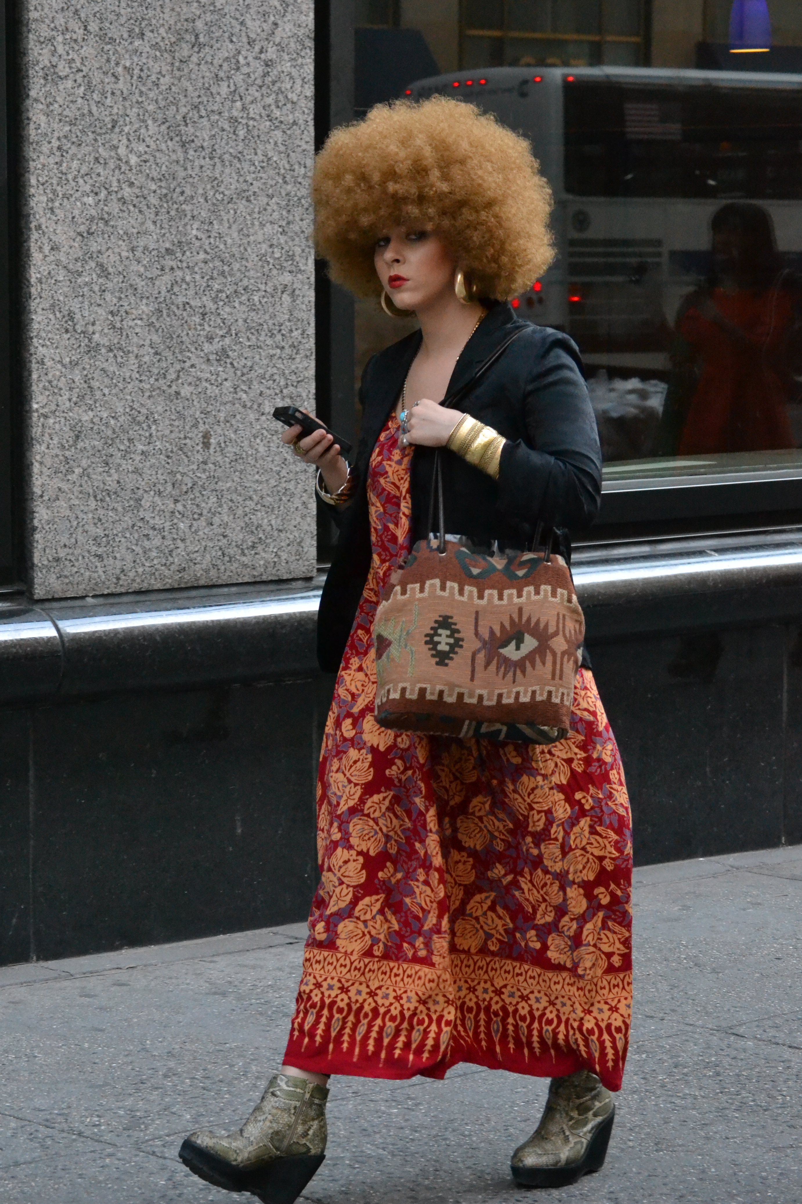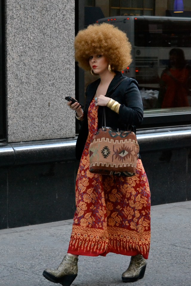 This woman truly stands out from the crowd. One would think that so many patterns in one outfit would clash, but she pulls it off well. Her red maxi dress is adorned with a yellow and purple floral print. Her ankle boots are covered in python print, and her handbag covered in Navajo symbols. The black blazer helps to keep the patterns separated and in harmony.