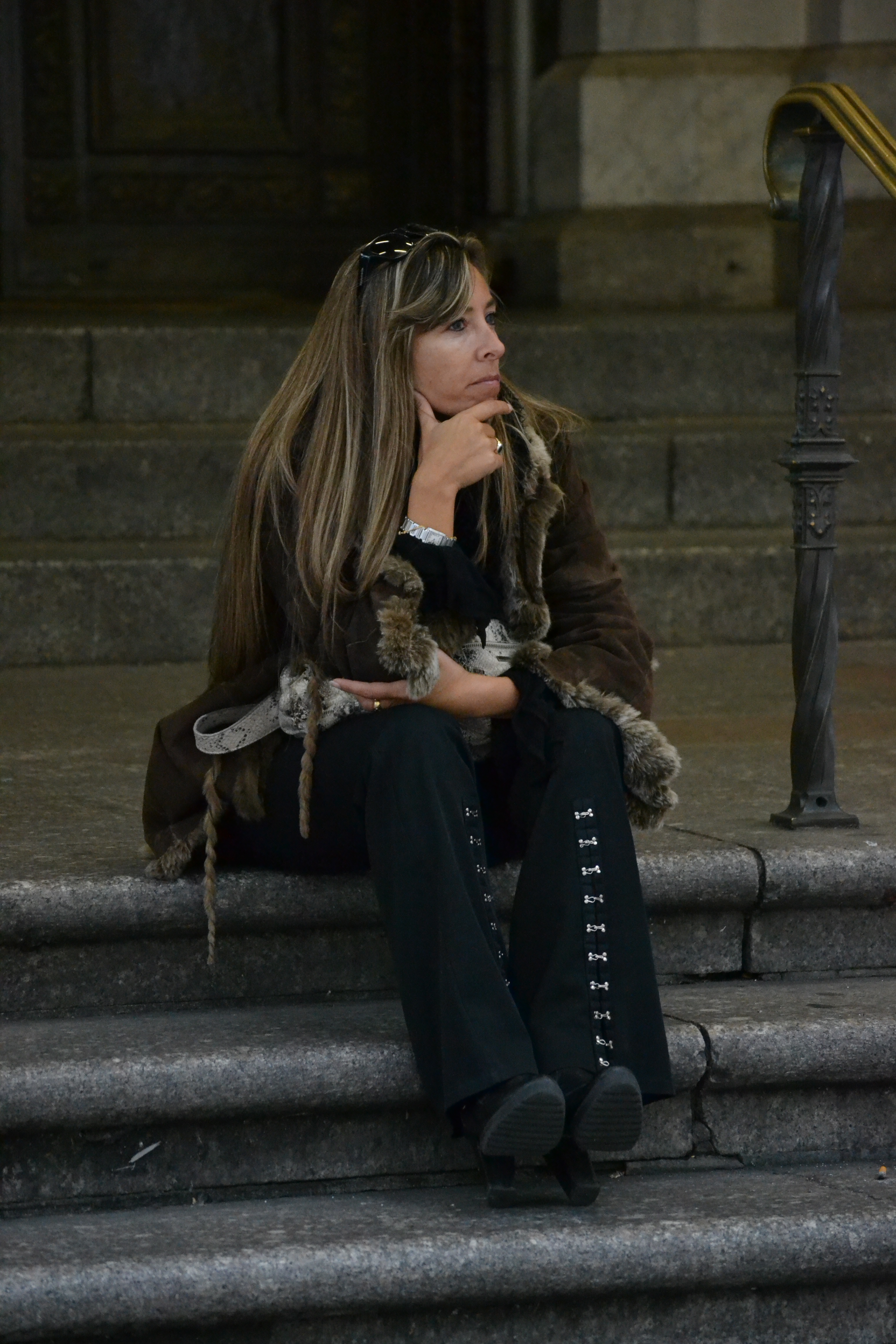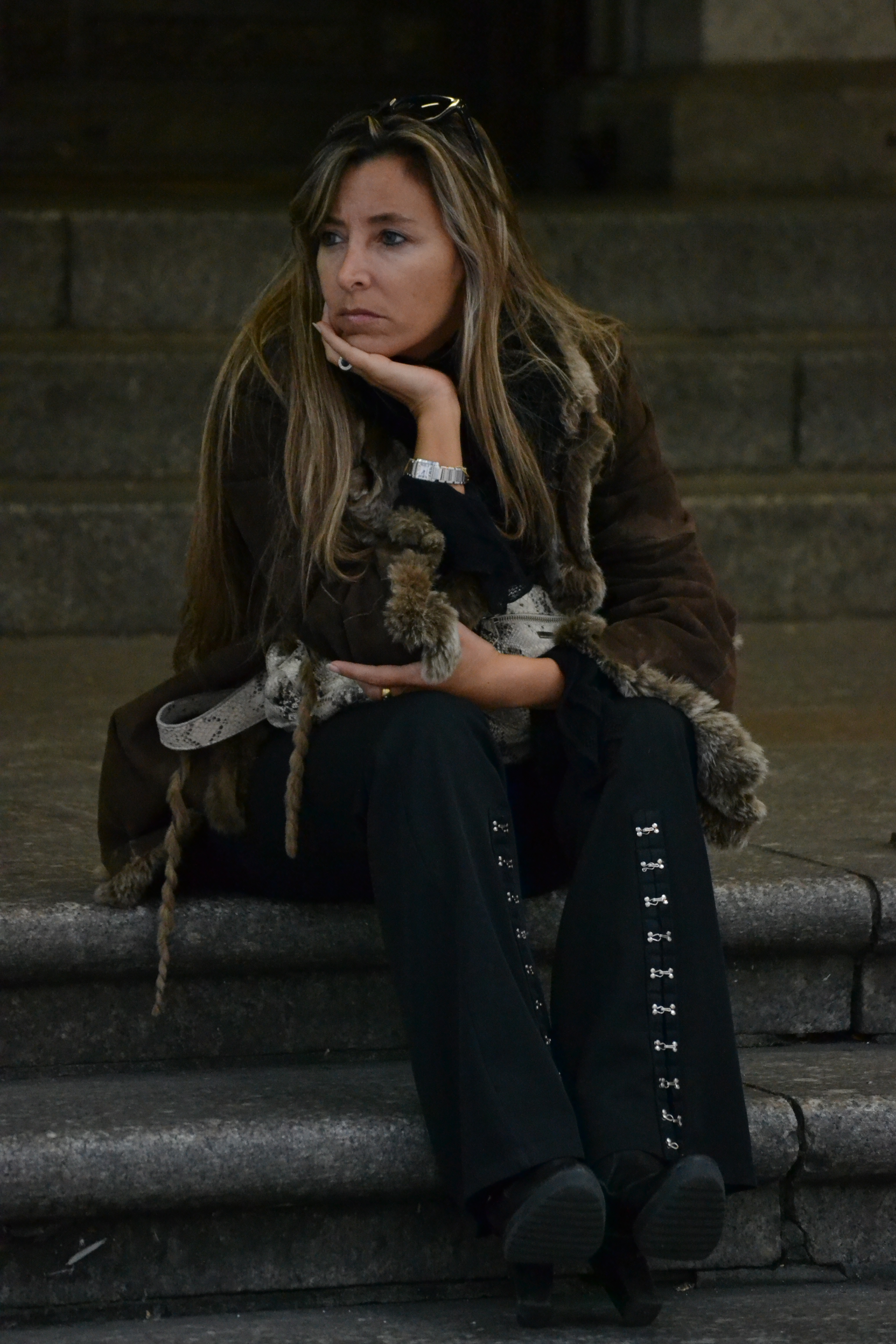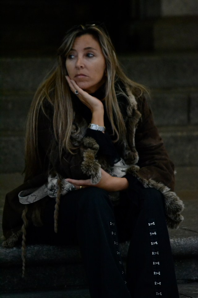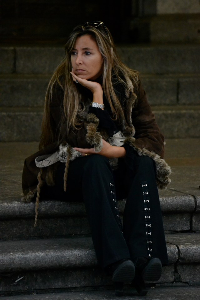 I found this woman sitting on the steps of St. Thomas Church. She looked as though she was waiting for someone, with a sense of longing in her face. The mix between the emotion and the fashion statement she was making, made her the perfect subject. Her fur trimmed coat definitely added some flare to her look. Her python print handbag, cuddled in her lap, is a great statement piece for this dark colored outfit.