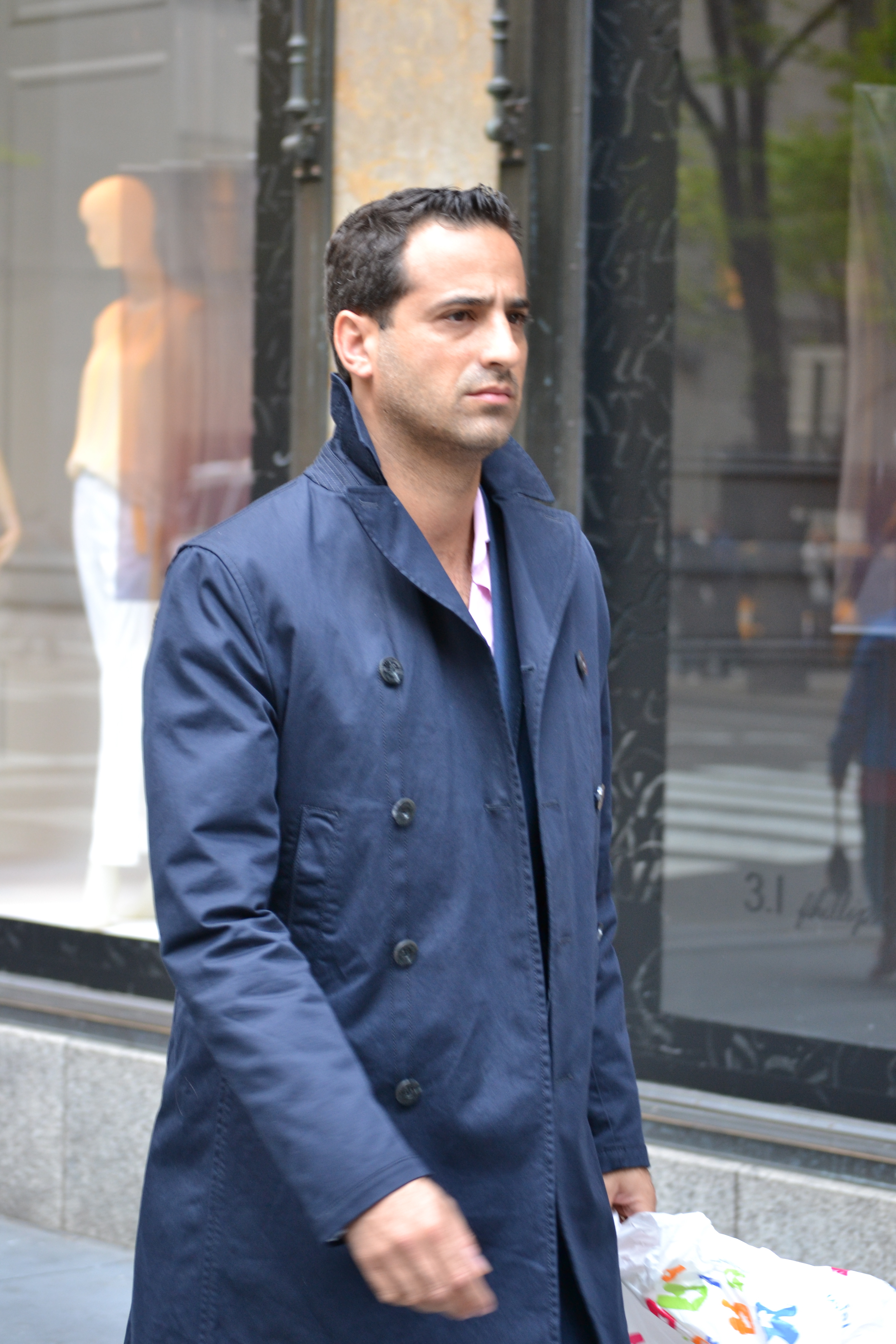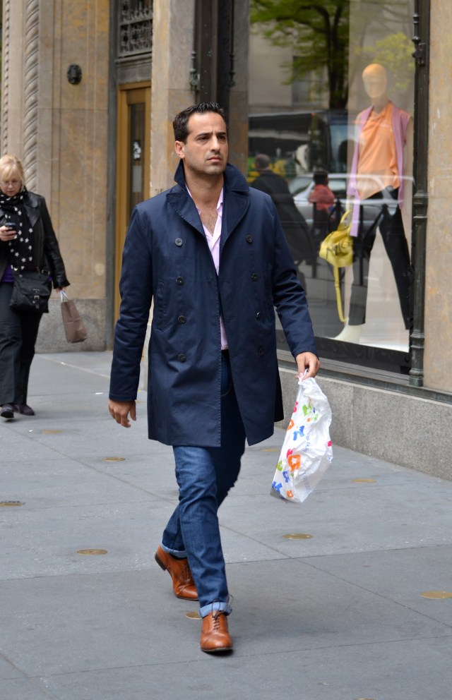 There is something about a popped collar that gives off a cool and cocky appearance. Maybe it is its affiliation with Arthur "The Fonz" Fonzarelli and James Dean, that has created that reputation, but it still sticks to this day. This man popped his collar on his blue trench, and even though he is carrying a Toys "R" Us bag, he still looks tough (and stylish). Underneath his trench peaks a pink button down shirt. His straight leg jeans are crisp and cuffed at the bottom, leaving them to fall perfectly onto his brown leather shoes.