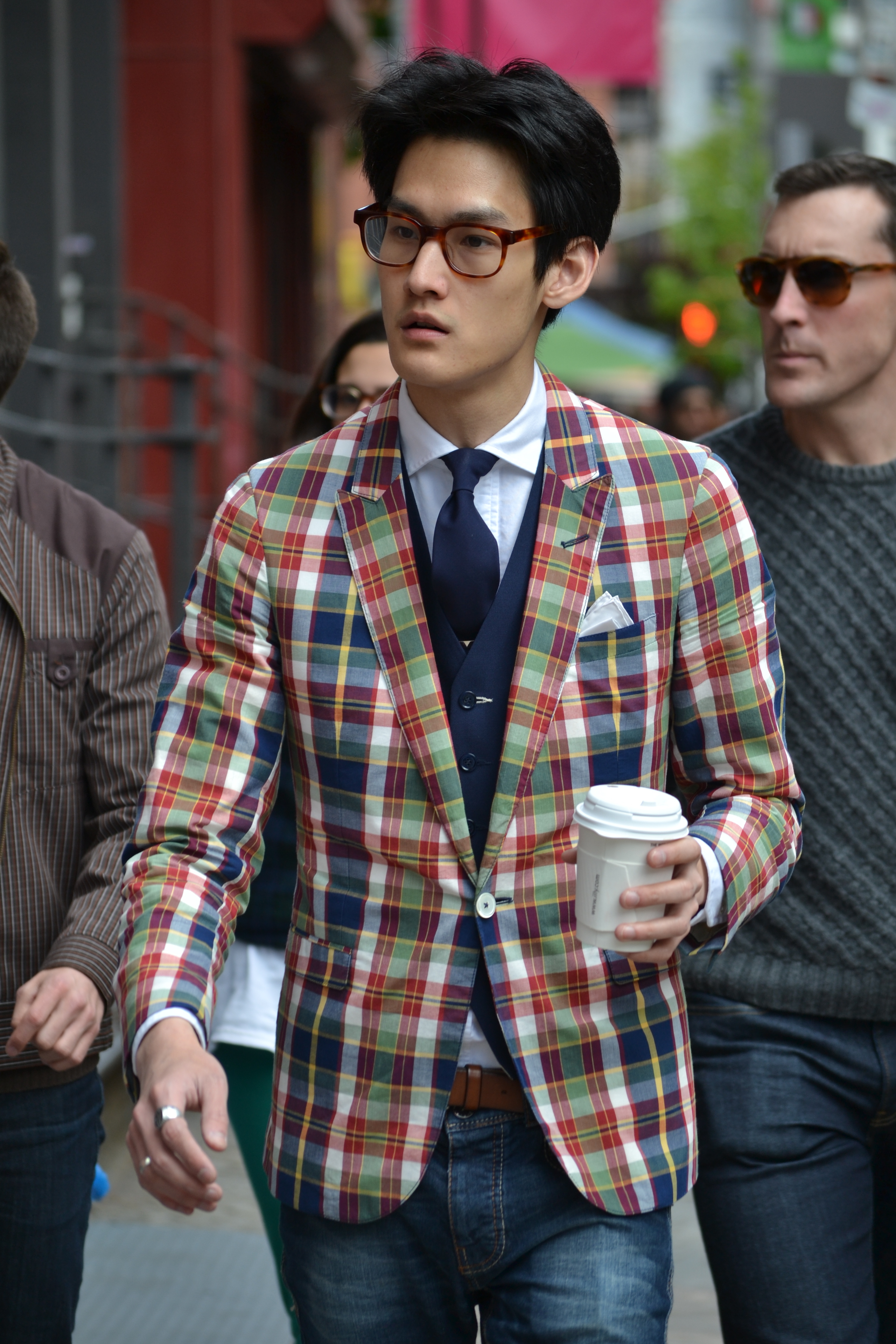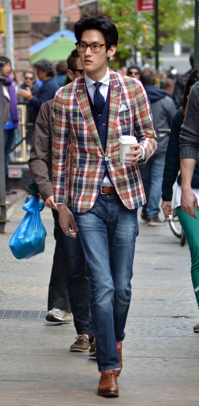 The plaid sport coat was a big hit in the 1970’s; today it is back. This slim fitting sport coat is colorful yet refined, making it appropriate for many occasions. The solid blue vest and tie and white shirt are a great compliment to the busy plaid pattern. The relaxed straight leg jeans and brown shoes give the jacket a more casual context. The pink socks are a nice surprise of color.