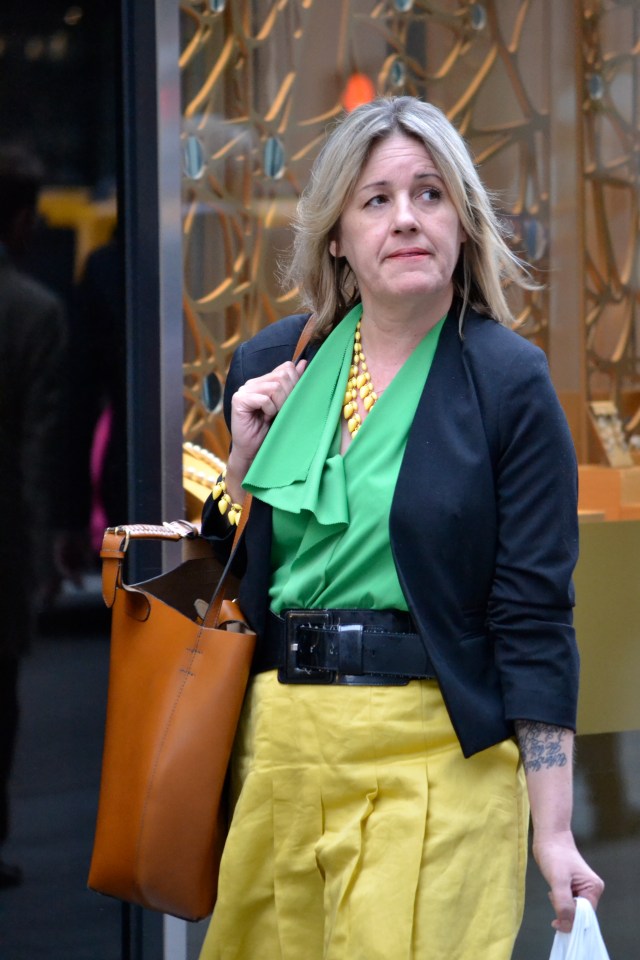 A colorful outfit is always enjoyable. Not only does it make you stand out from the crowd, but it also makes you feel and look warmer. Sometimes two strong colors don’t converge well, even though they go together. This woman has taken this into consideration and divided the two colorful pieces with a thick black belt. The belt works as a buffer zone, hiding the junction where to green blouse and yellow skirt come together. The black belt, blazer and stockings also give the colors some contrast from which to stand out.