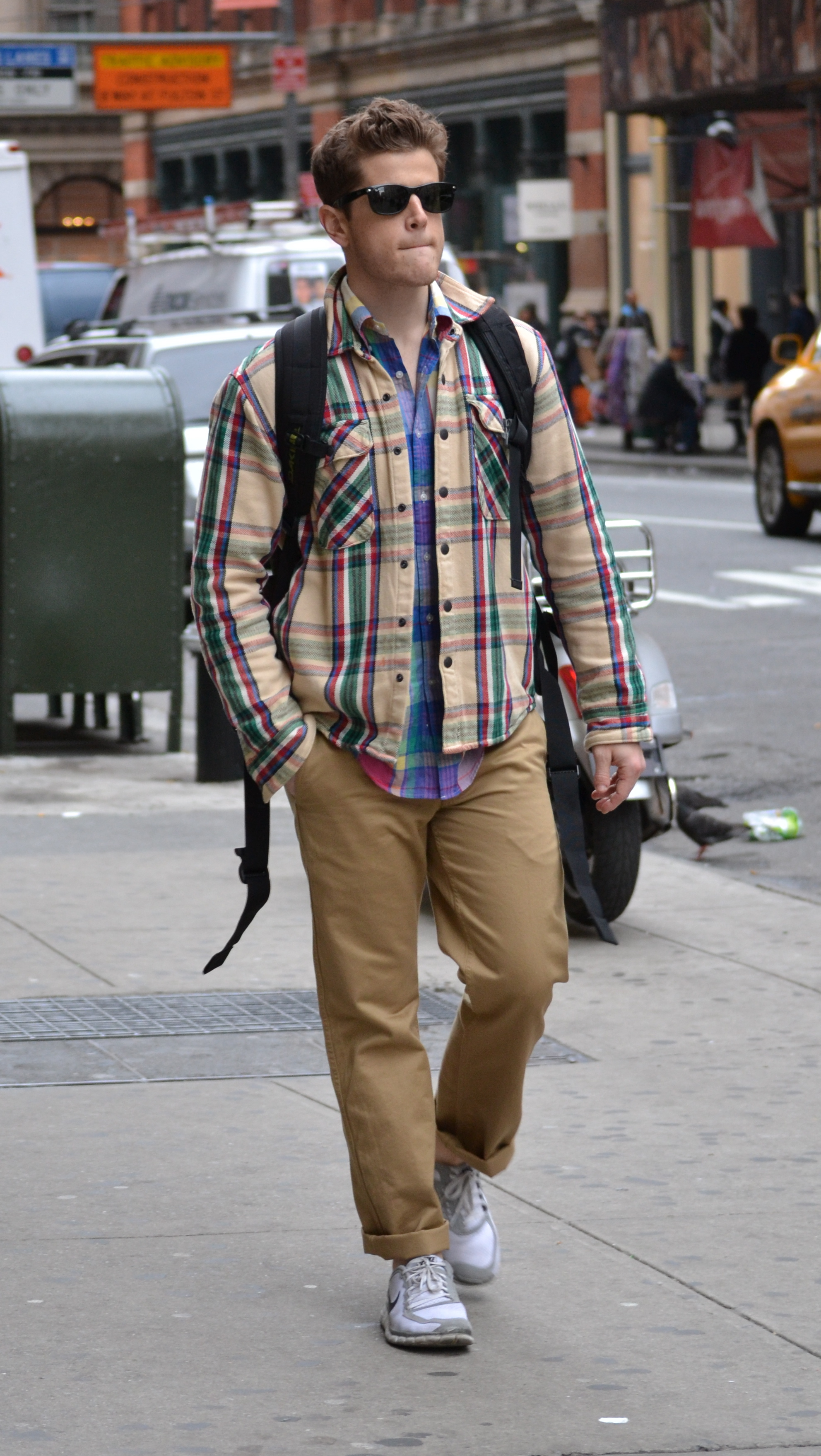 This backpack toting young man has a very relaxed style about him. His chinos are rolled a couple times, showing his Nike running shoes. But in his choice of tops is where this outfit gets interesting. He has on an untucked plaid button down shirt, below a plaid flannel shirt. The two have similar patterns, but different color schemes. It is interesting how they do not clash, rather the button down creates a nice accent for the flannel.