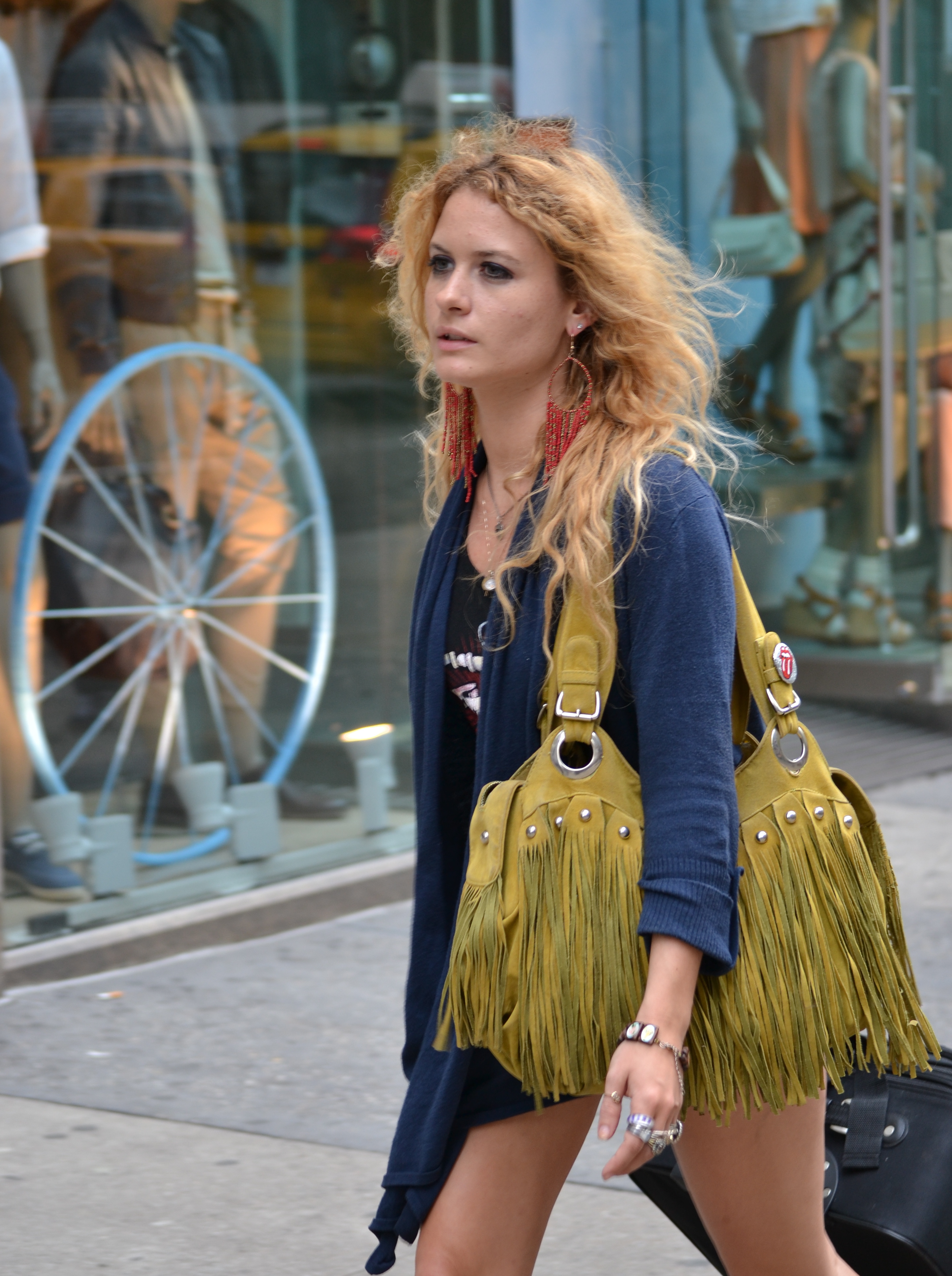 This 60’s inspired look is done extremely well. The tan shorts and scoop neck graphic tank are great for the spring heat. The deep blue wrap adds warmth and helps her to look loose and casual. The air dried wavy hair, accompanied by long red beaded chandelier earrings, is a look straight out of Woodstock. The moss colored bag, covered in fringes, has a very earthy feel and goes well with the tassels on her gladiator sandals. Finally the rings and other jewelry items are great accessories for that hippie chic look.