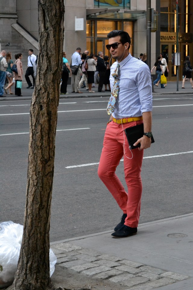 A simple business casual outfit done well. This man strays from the simple black slacks or khakis and opts for a red pair of slim fit jeans. The black suede shoes are a nice compliment, which helps to ground the jean’s bold color, while the orange belt adds a nice accent to an already colorful pair of pants. The fitted, blue striped dress shirt continues the form fitted look and goes well with both the pants and the colorful paisley tie running down its center.