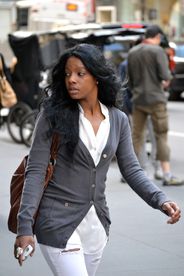 Another early Spring gem from Fifth Avenue. Her ripped white jeans are ankle length, with an elastic cuff. They have a casual and cool look and are perfect with the green thong flip flops. Over a white, button up blouse, she wears a long, hip length, grey cardigan. The middle three buttons are closed, creating the appearance of a tighter waist and an hourglass silhouette.