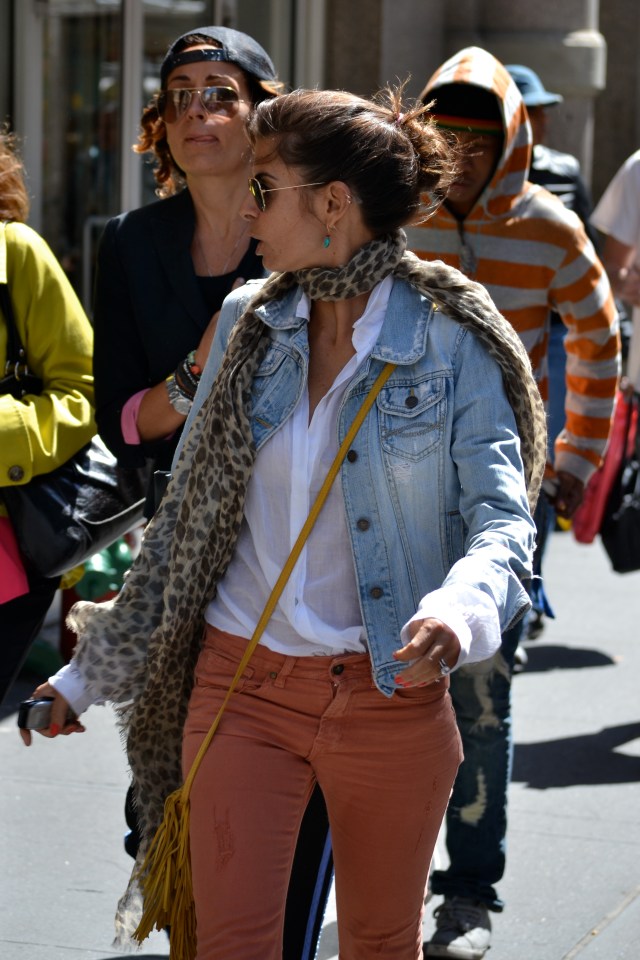 This is a very well put together outfit. I really like the interplay between the faded blue jean jacket and the rust ankle length flared jeans. The ankle length cut allows for the bedazzled ballet flats to have an unmitigated display at ground level. The sheer white button down is very nice for Spring. It allows for an airy, yet covered feel, and I love the way it looks underneath the jean jacket. The layering affect of the white sleeves showing bellow the cuffed jean jacket is a great look. The leopard print scarf and fringed suede purse add tantalizing texture to the ensemble.