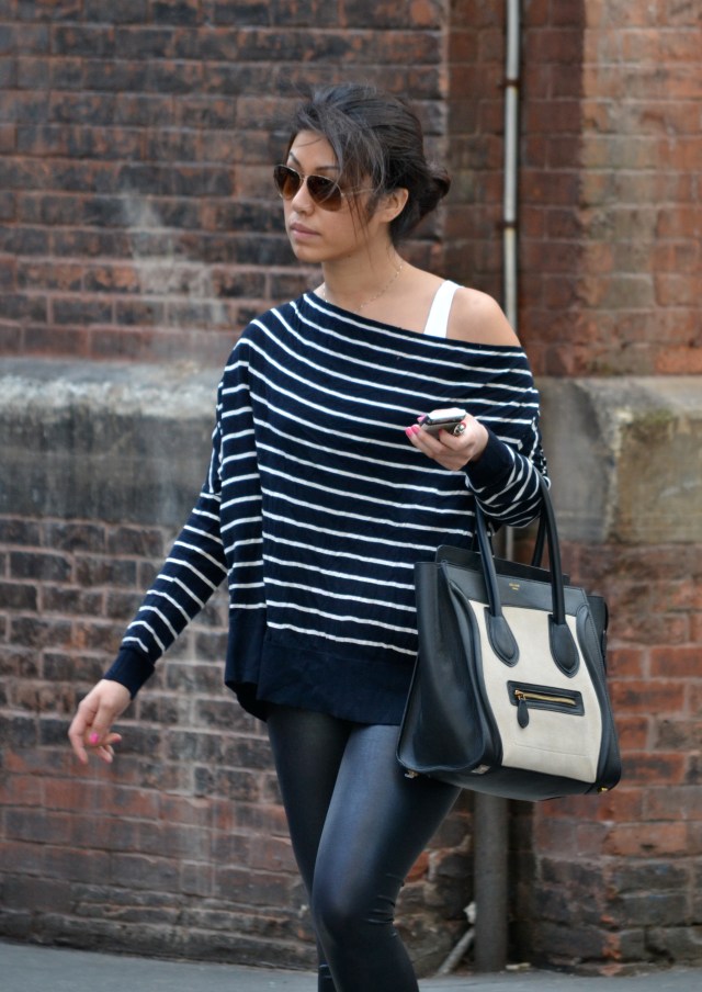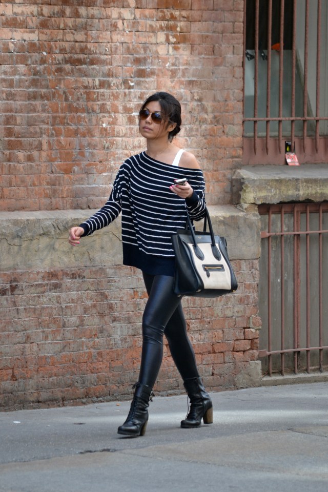 This young lady wears a relaxed outfit with style. Her navy and white striped shirt hangs off her left shoulder, showing the strap of a white tank. She has on a pair of black, faux leather leggings, which have a nice sheen to them. They are tucked into a pair of black, heeled boots, adorned with a buckled cuff on the top. The Céline tote in black and cream is a new “it” accessory, and its awkward smile adds a little character to the outfit.