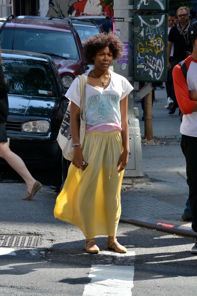 This is a fun outfit for this Spring. The colors are light and the fabrics are thin, allowing you to feel comfortable in the heat of the Spring Sun. The loose fitting, white v-neck tee from Juicy Couture, has a fun graphic that transitions from light blue to soft pink. Below the shirt’s pink bottom is a canary yellow, ankle length maxi skirt. The semi-sheer fabric allows your natural silhouette to show through, which looks fun and flirty, as well as comfortable. The ballerina flats on her feet add to the airy feel and look great with the yellow skirt just above them.