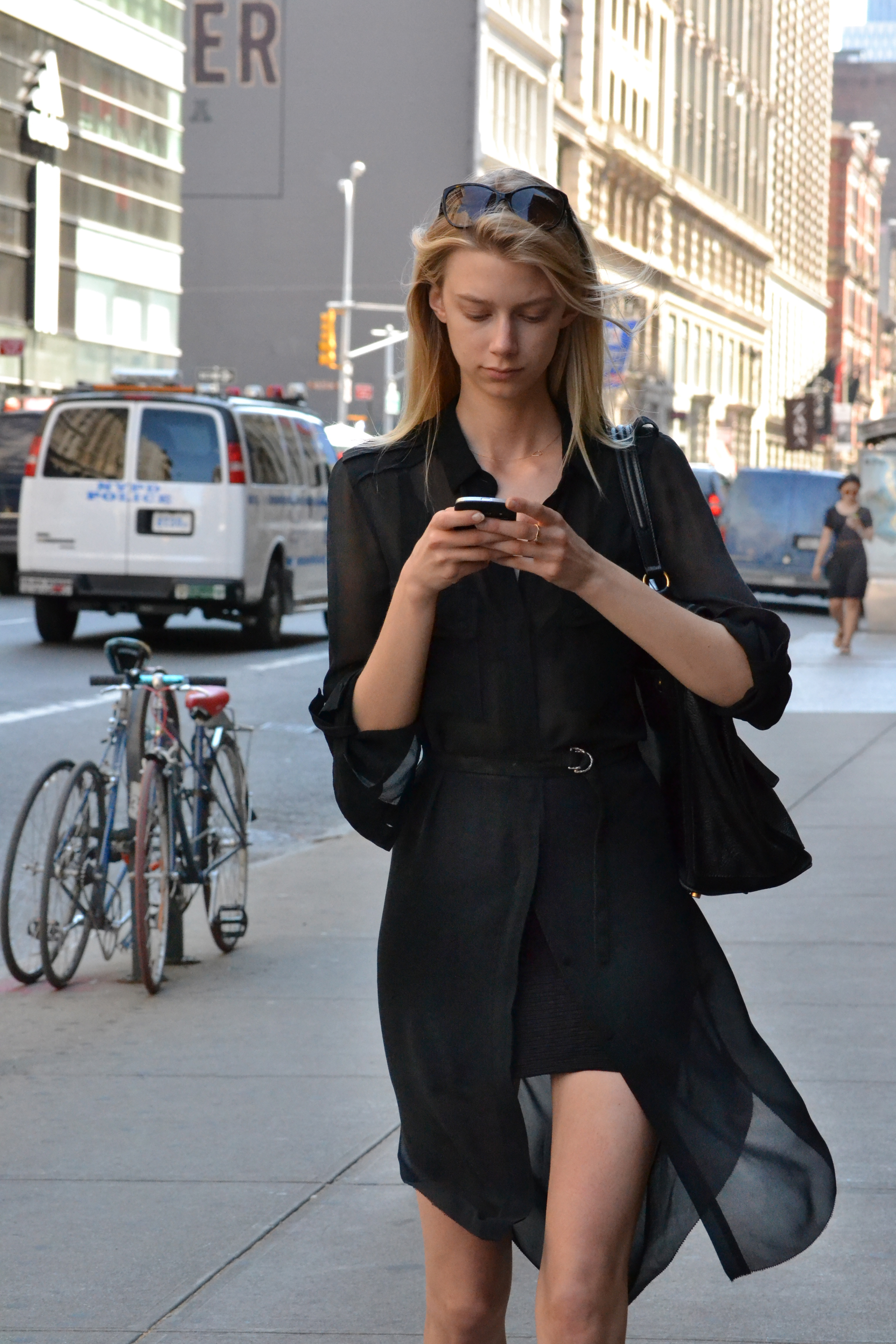 This tall, slender blonde walks confidently through the streets of NoHo. Her eyes glued to the screen of her phone, and her body draped in all black. She sports a black, sheer, button up dress, that is held around her waist with a skinny black belt. The dress is left unbuttoned at the bottom, revealing a stretchy, black mini skirt underneath it. Her black bra, keeps the motif alive, and creates a flirty look, without being too exposed. The black tri-strap ankle booties are adorned with brass pinhead studs, giving them a unique character in this all black outfit.