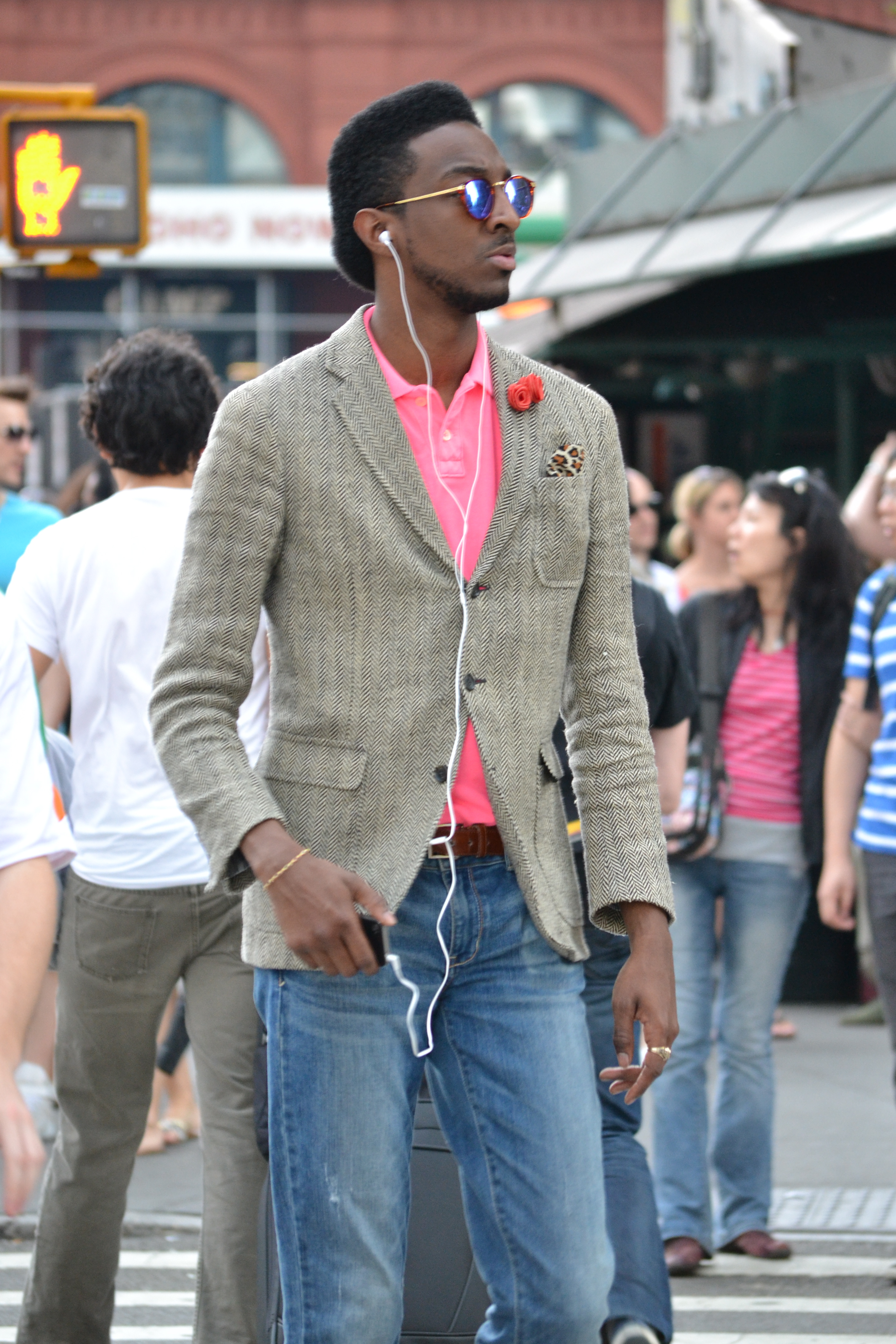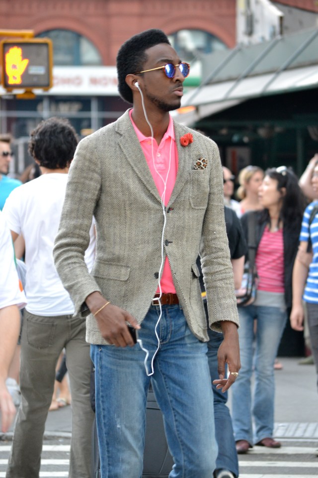 This young gentleman is a snazzy dresser. The combination of the slim fit jeans and tassel loafers looks sharp; however his personal style comes across in the upper half of the outfit. The hot pink polo is an exciting pop, exploding from underneath the European cut, herringbone blazer. The addition of the rose boutonniere and leopard print pocket square makes this outfit complete, leaving him looking suave and unique.
