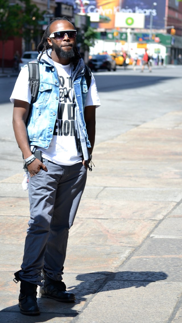I caught him on the streets in SoHo, after an interview with MTV, sporting a pair of grey jeans bloused over the top of unbuckled tanker boots. Over his white Irv Da Phenom shirt, he rocked a cut off sleeve jean vest and a fringed scarf around his neck. He had on a pair of futuristic, white shades to top off the look.