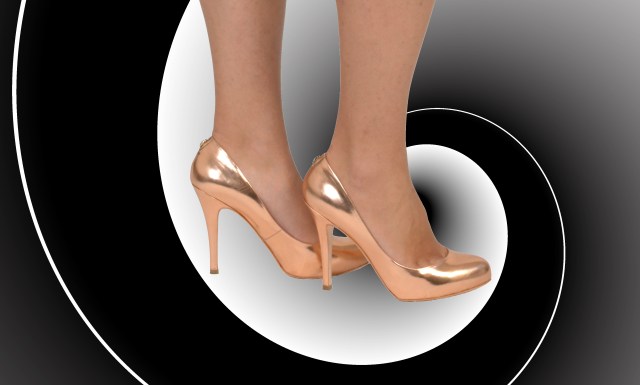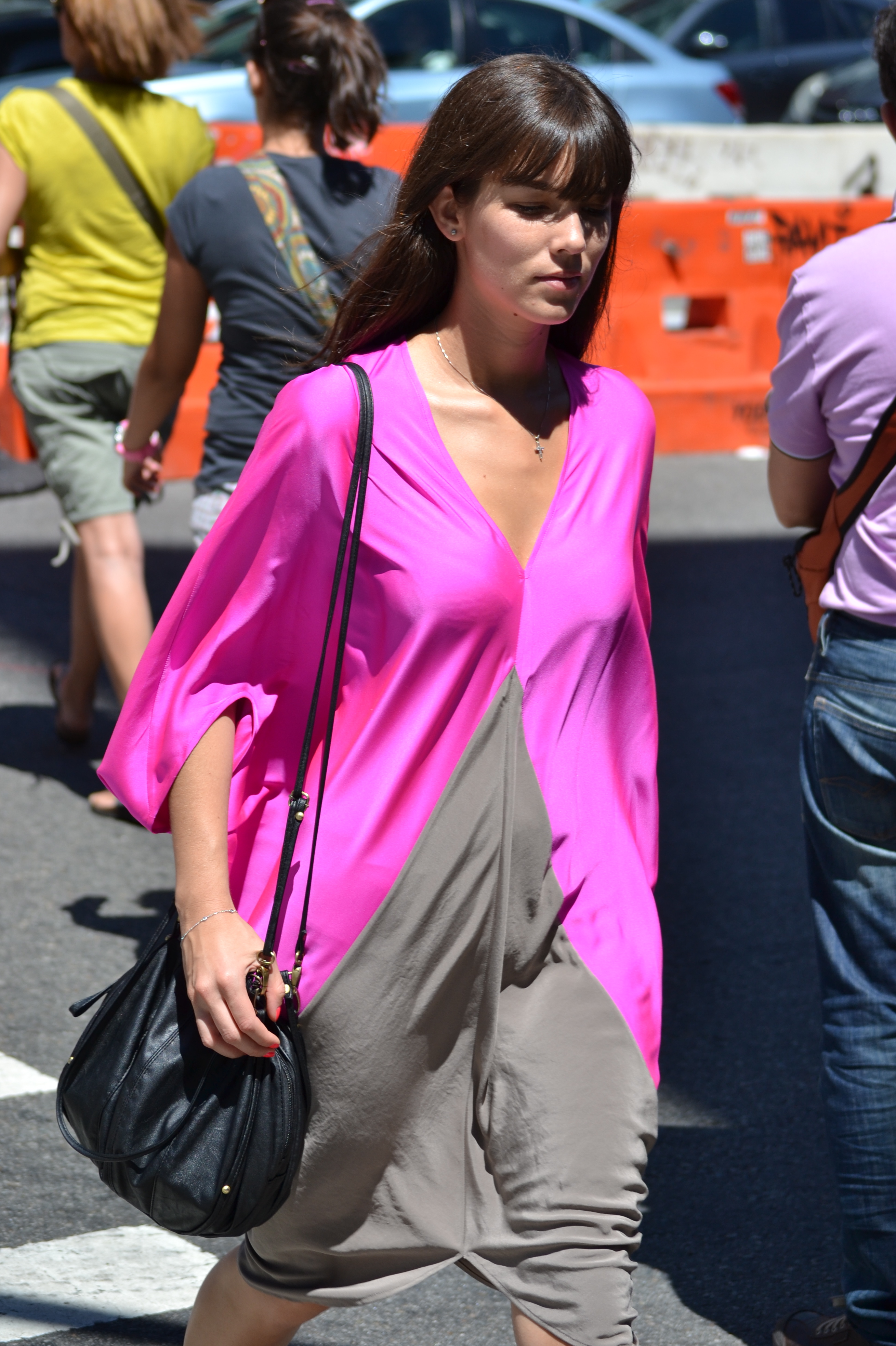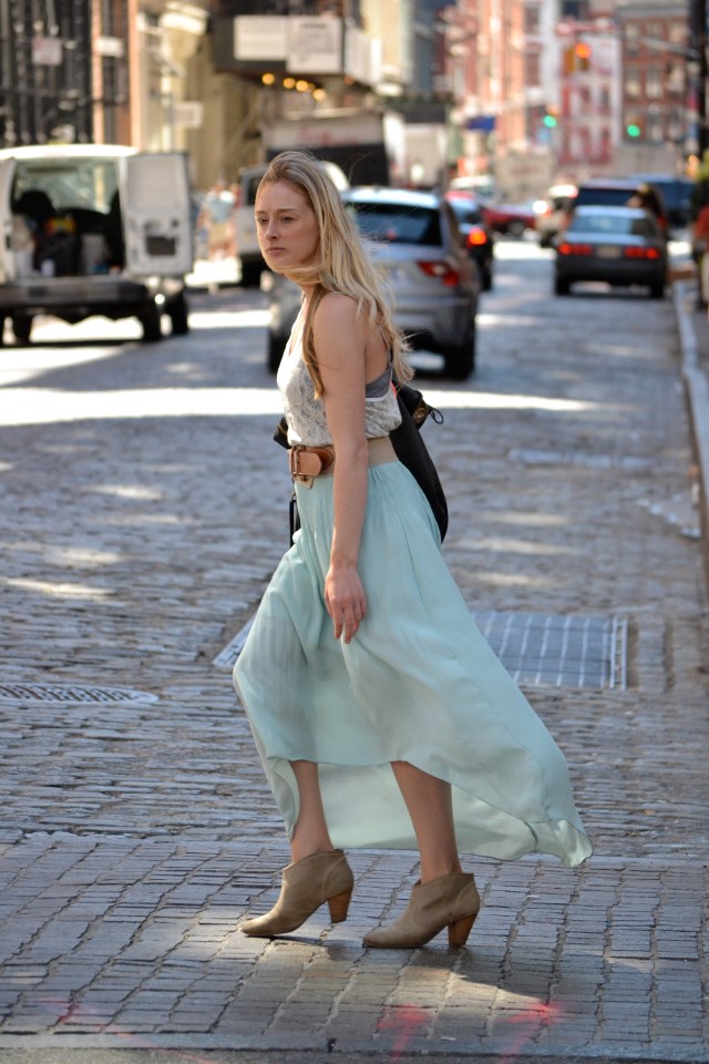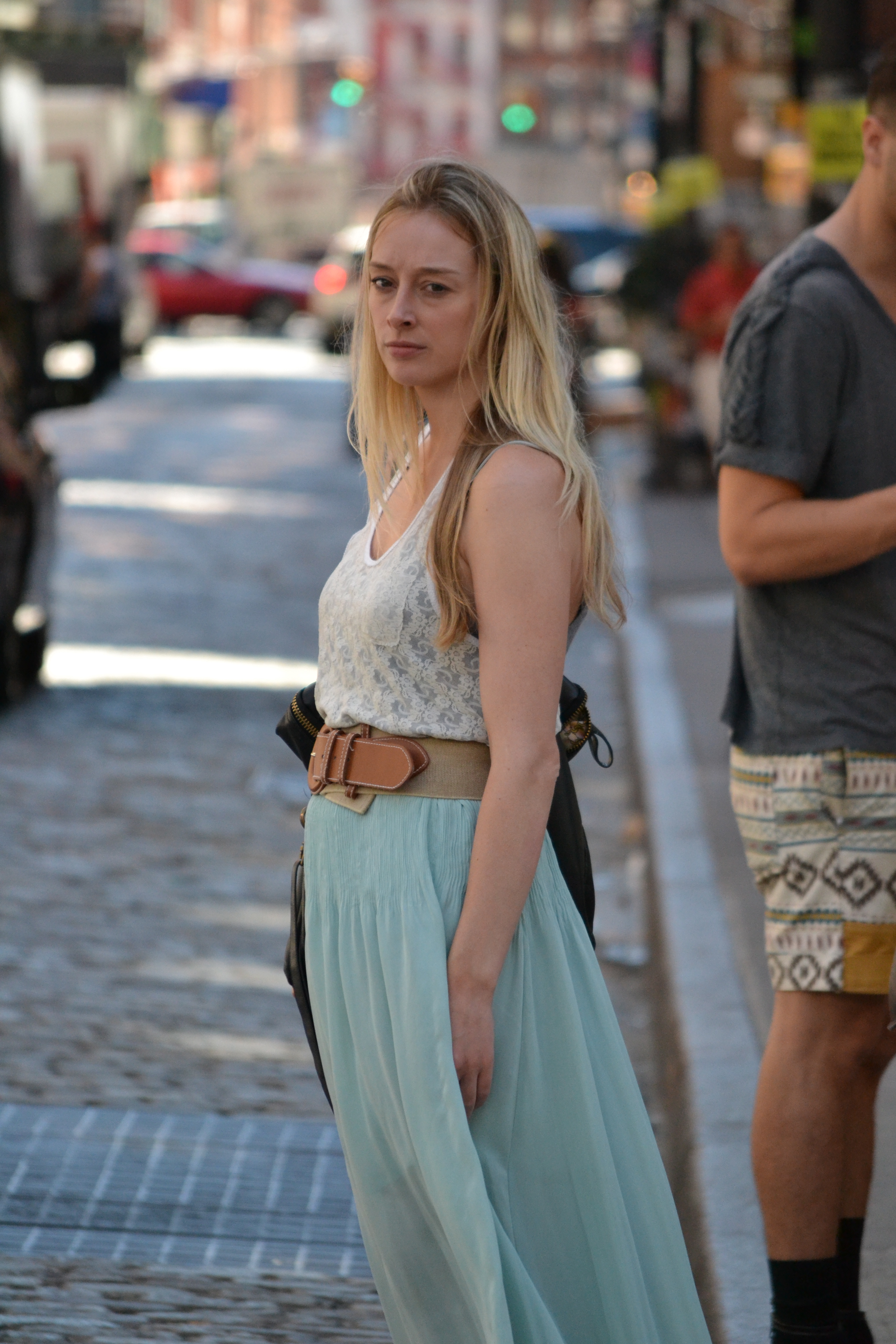 This blonde’s sun-kissed skin goes perfectly with the light mocha color of her button front dress. The sleeveless bodice, with white lace inlays on the shoulders, is buttoned all the way to the top, leaving the collar tight around her neck. The skirt is rippled at the seam, and falls just below mid-thigh. Her boots are incredible, their open toe and cutout sides are a strong contrast from what you would normally expect from a lace up boot. The gold necklace is a thing of beauty, with its intricate, independently moving pieces and textures. Her tortoise shell Ray Ban wayfarers hide her eyes, while the strawberry lipstick gives her lips a strong pop.