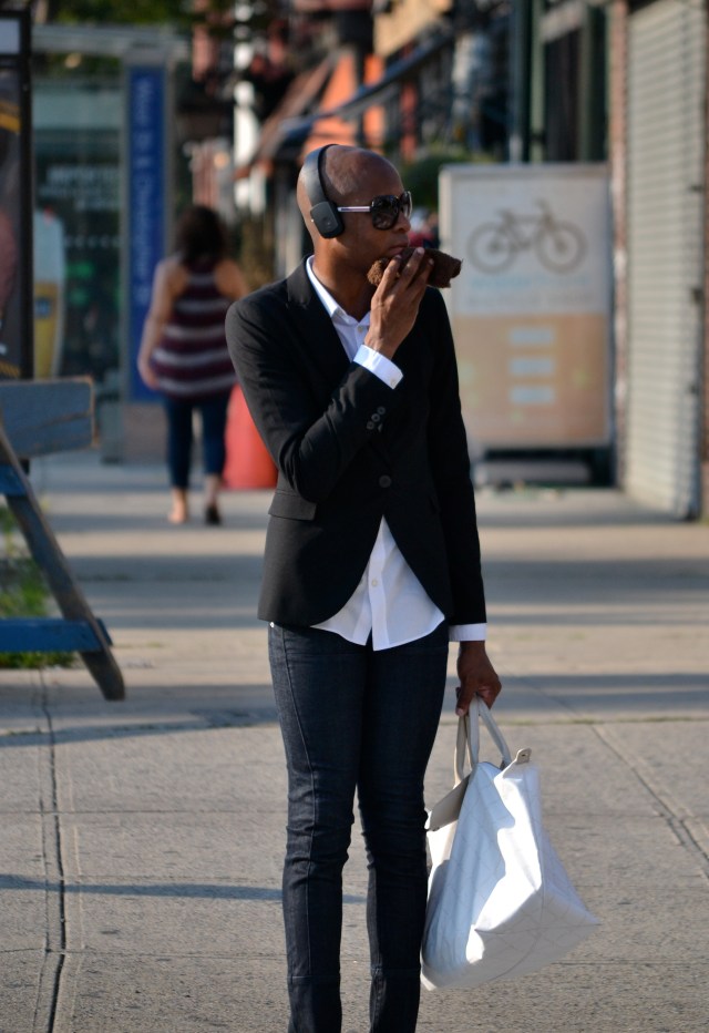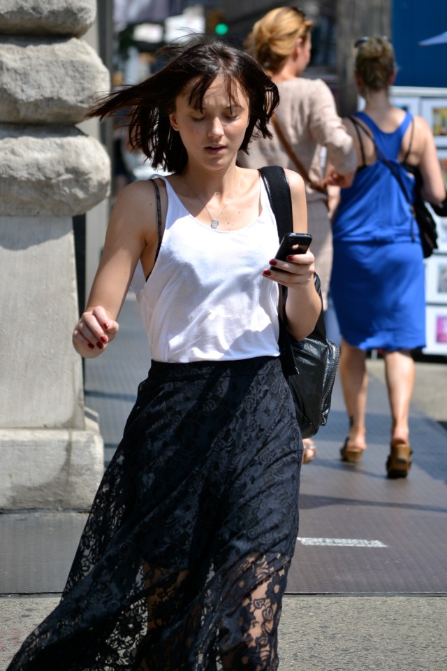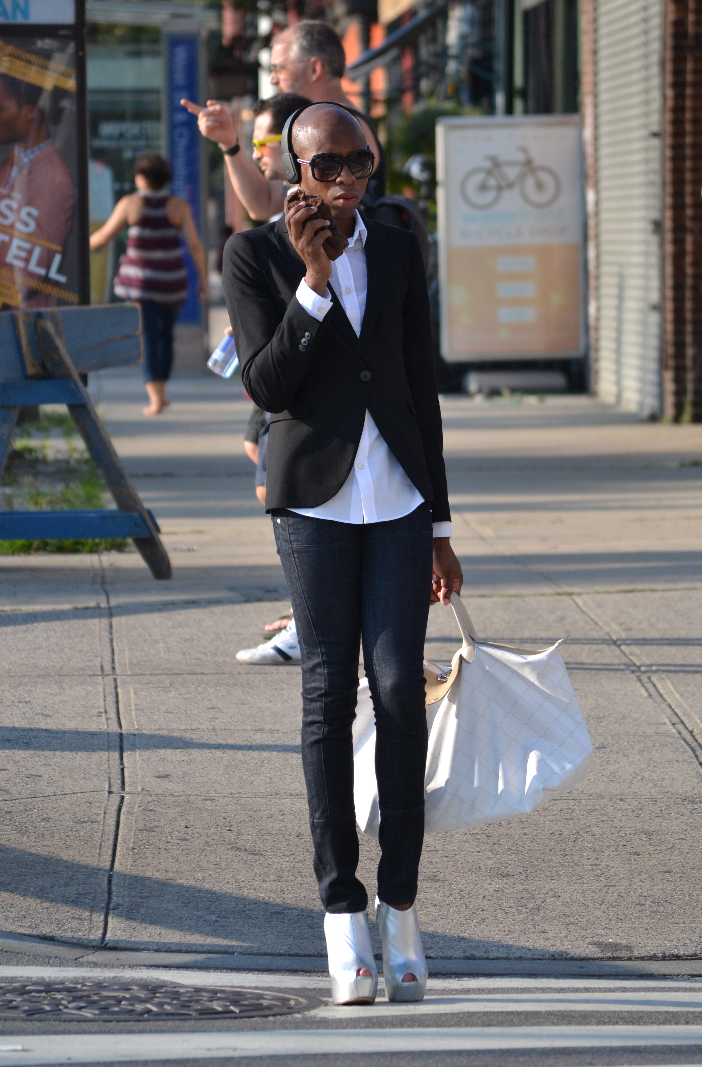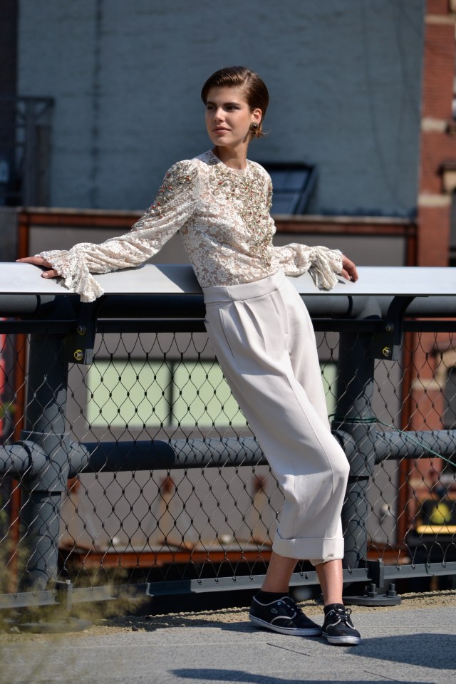 I figured I’d try something different, and ended up on The High Line this week. I am lucky I did because I came across this stunning model posing for a shoot. With her hair slicked back and her makeup done, she braved the hot sun to provide the perfect pose. The lace blouse she wore is stunning, with a Renaissance look to it, especially with the bell cuffs on the sleeves. The gold weave and encrusted jewels create a lovely design that screams “high fashion!” The white, pleated trouser, into which the blouse is tucked, creates a nice a simple, refined buffer. The cuffed legs provide a little air circulation in the heat and also show off the Lacoste tennis shoes, which are perfect for the boardwalk feel of the High Line.