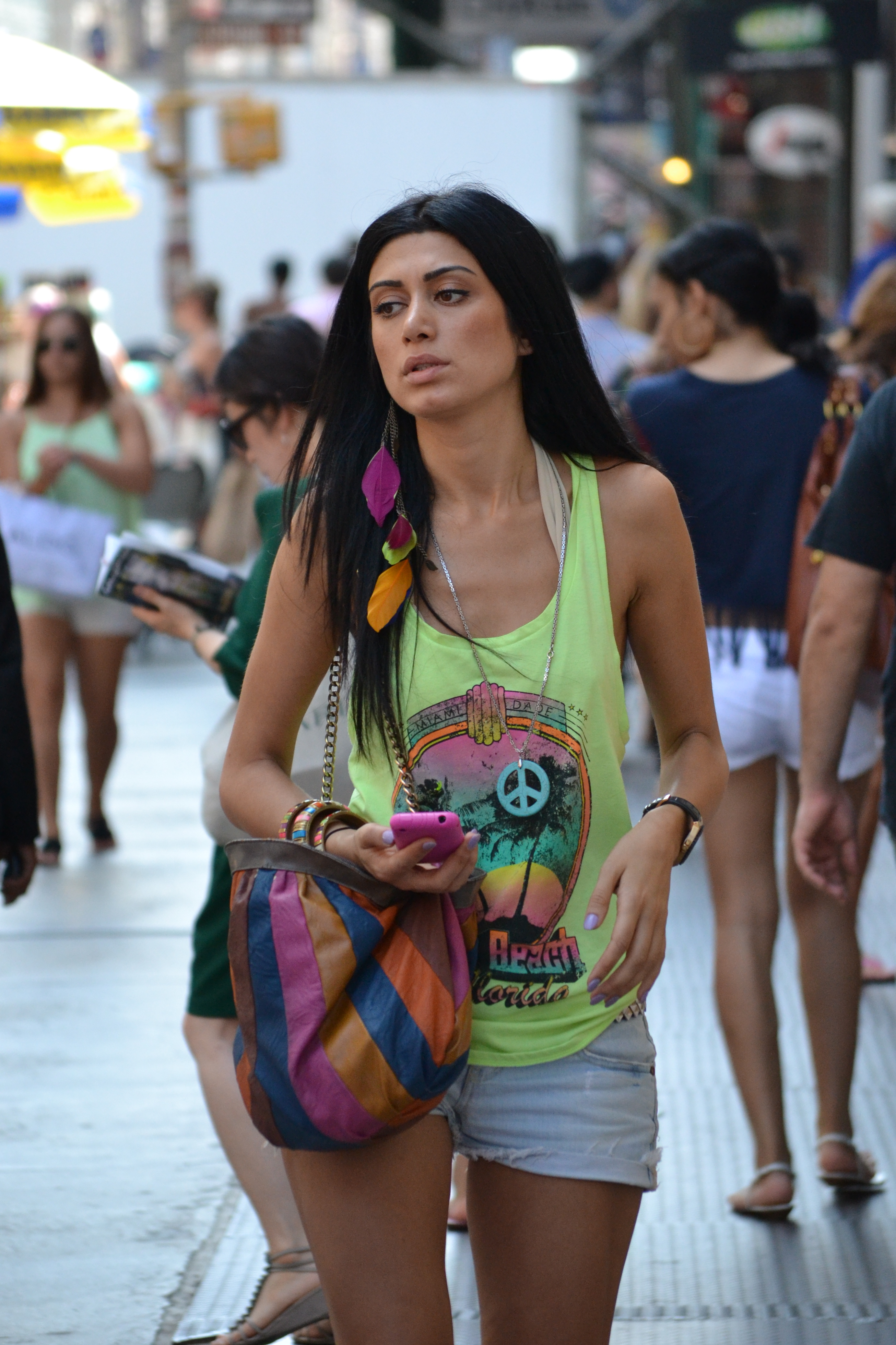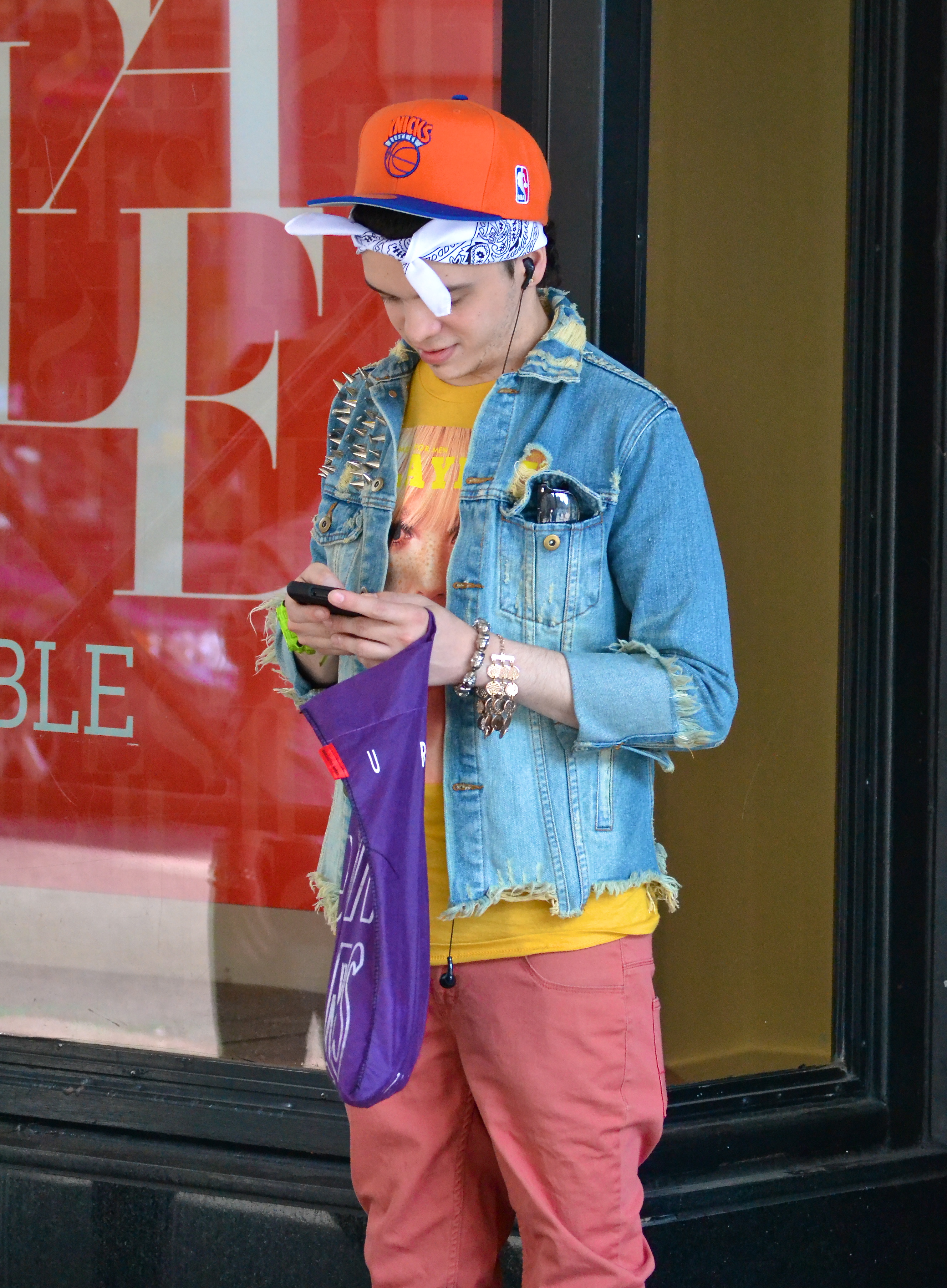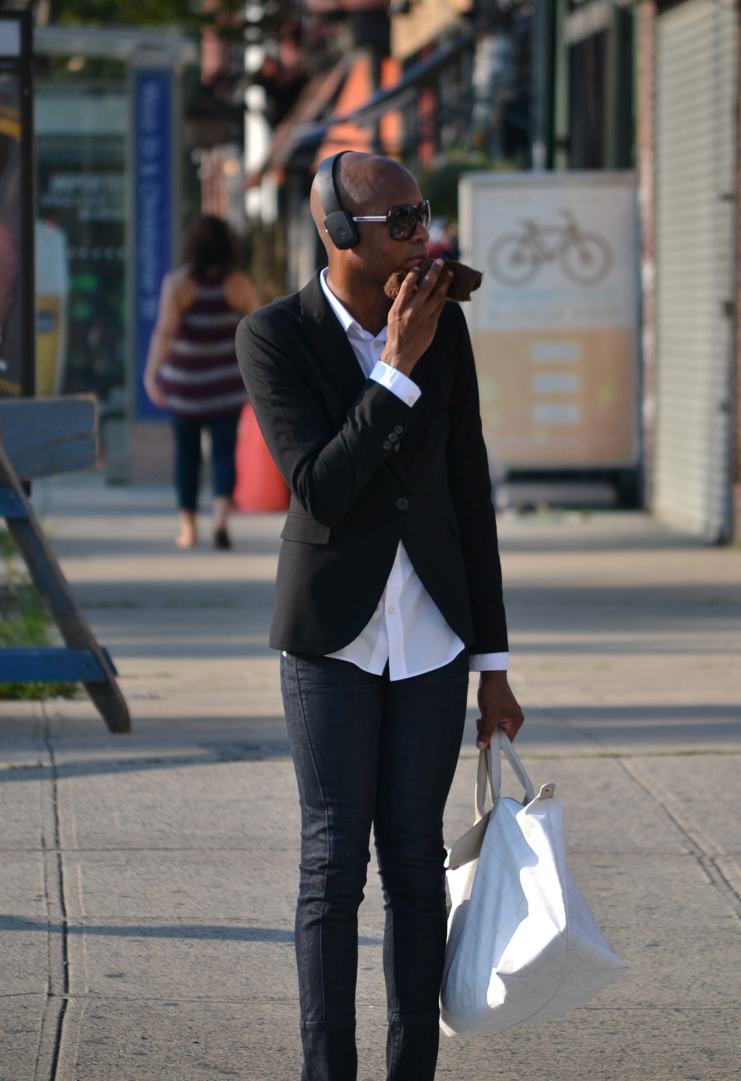 I figured I’d try something different, and ended up on The High Line this week. I am lucky I did because I came across this stunning model posing for a shoot. With her hair slicked back and her makeup done, she braved the hot sun to provide the perfect pose. The lace blouse she wore is stunning, with a Renaissance look to it, especially with the bell cuffs on the sleeves. The gold weave and encrusted jewels create a lovely design that screams “high fashion!” The white, pleated trouser, into which the blouse is tucked, creates a nice a simple, refined buffer. The cuffed legs provide a little air circulation in the heat and also show off the Lacoste tennis shoes, which are perfect for the boardwalk feel of the High Line.