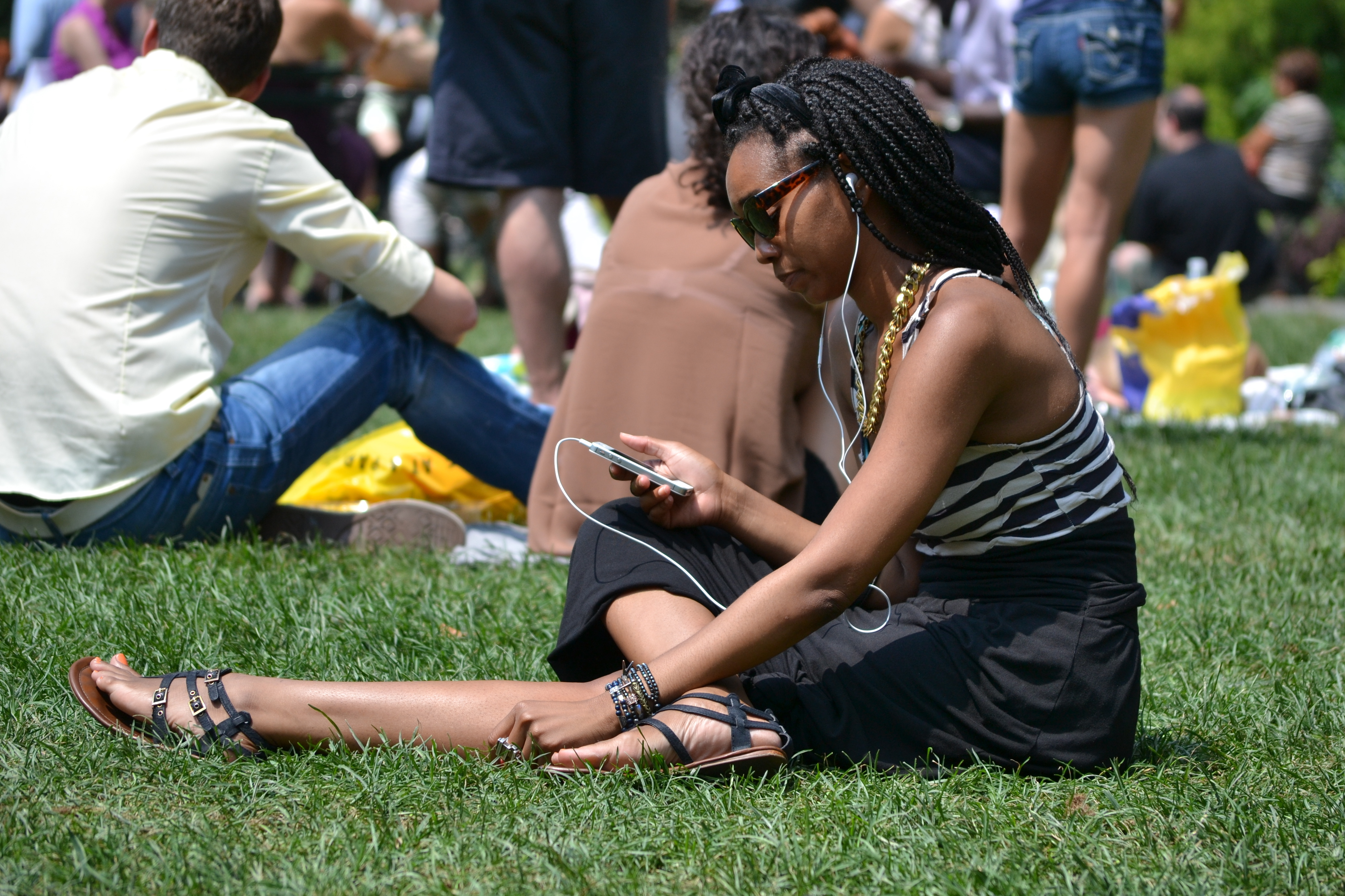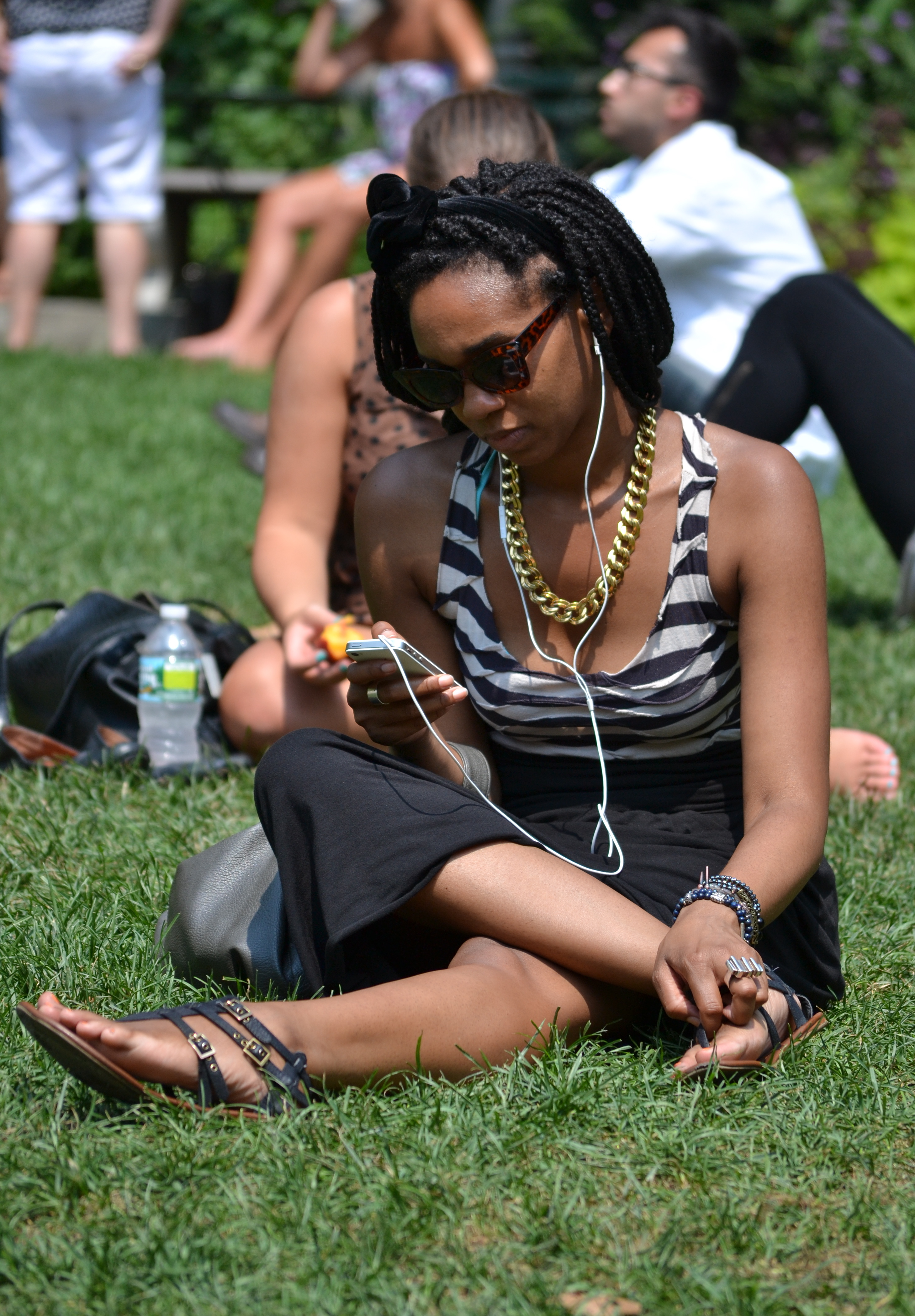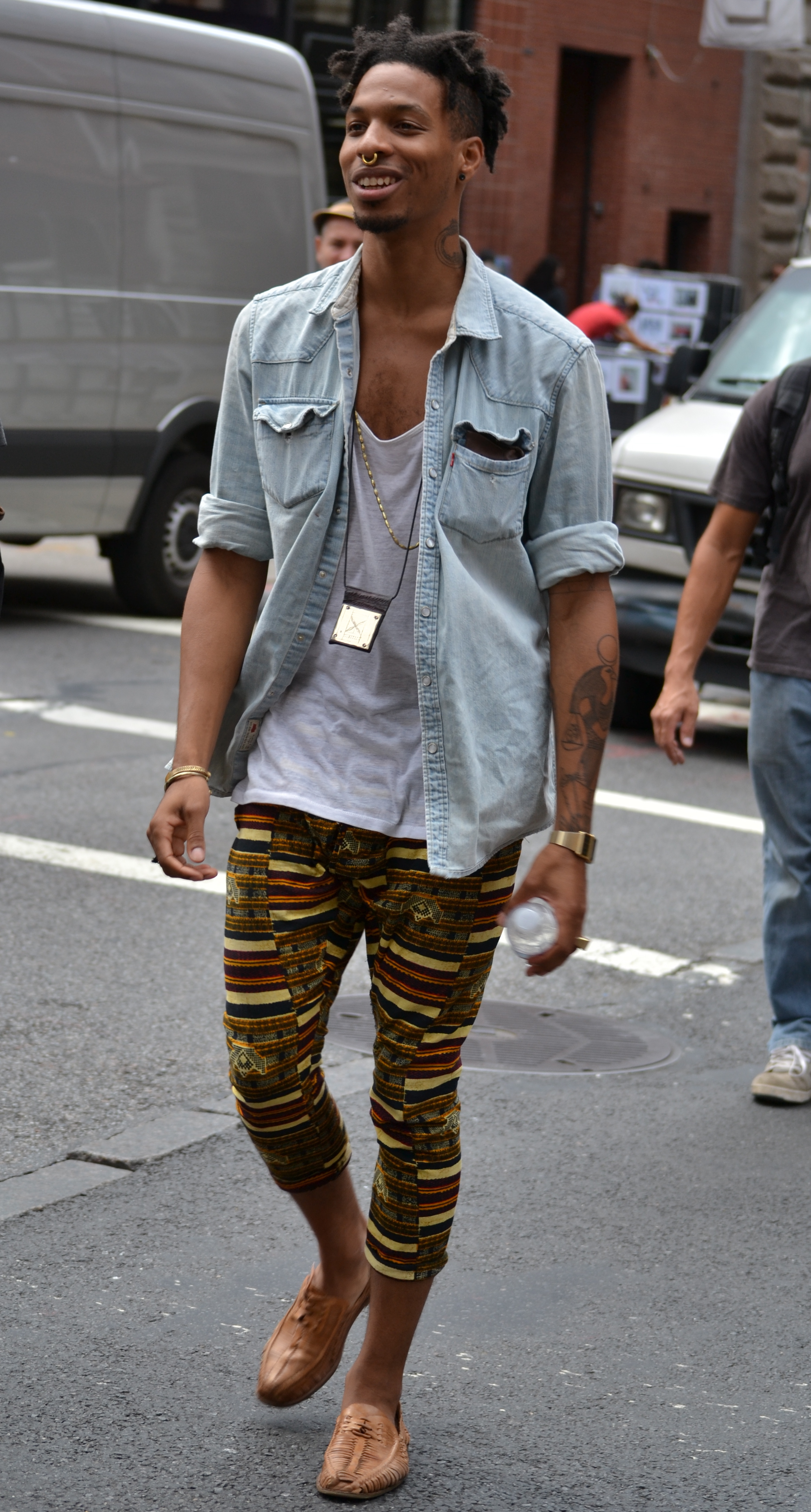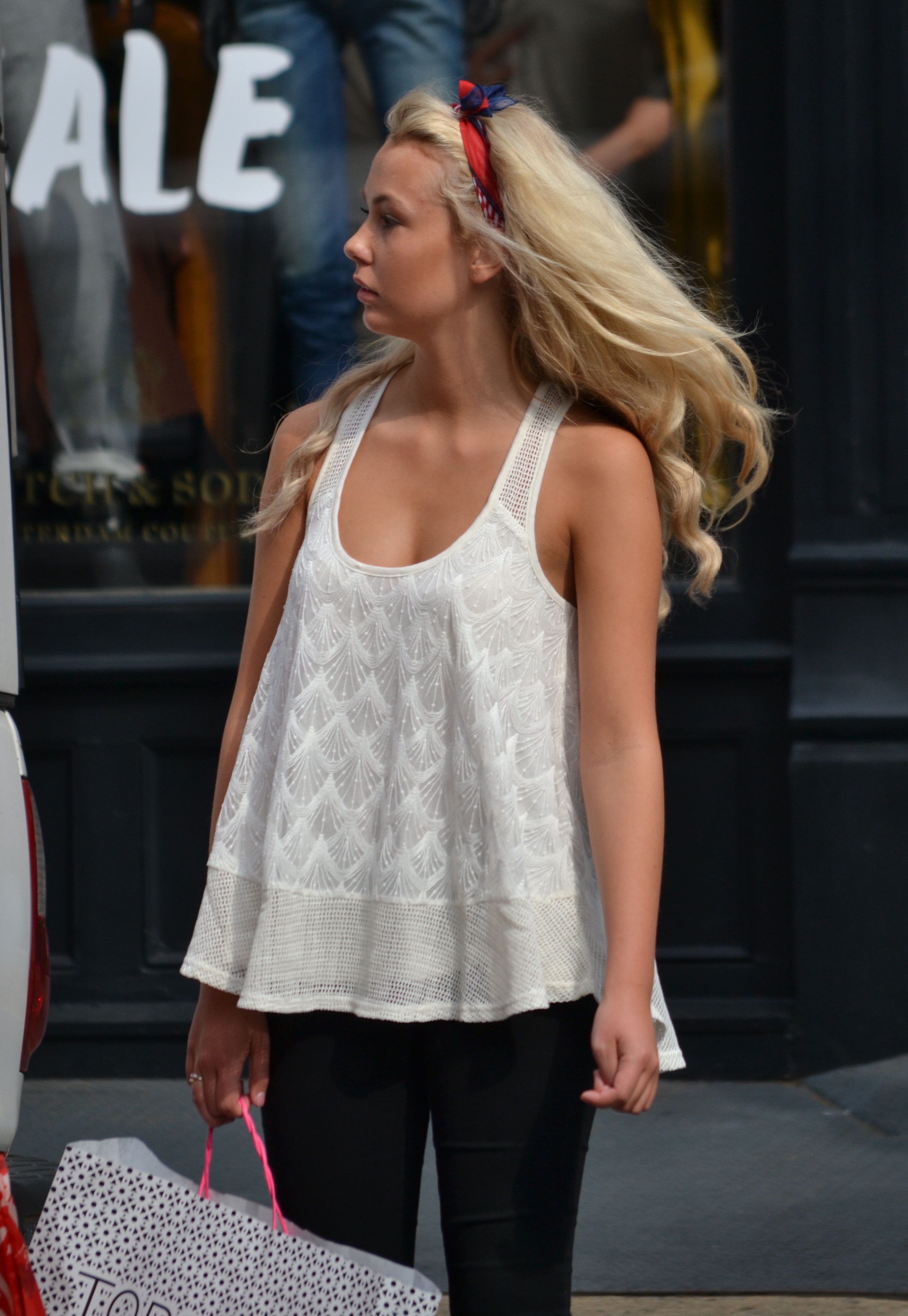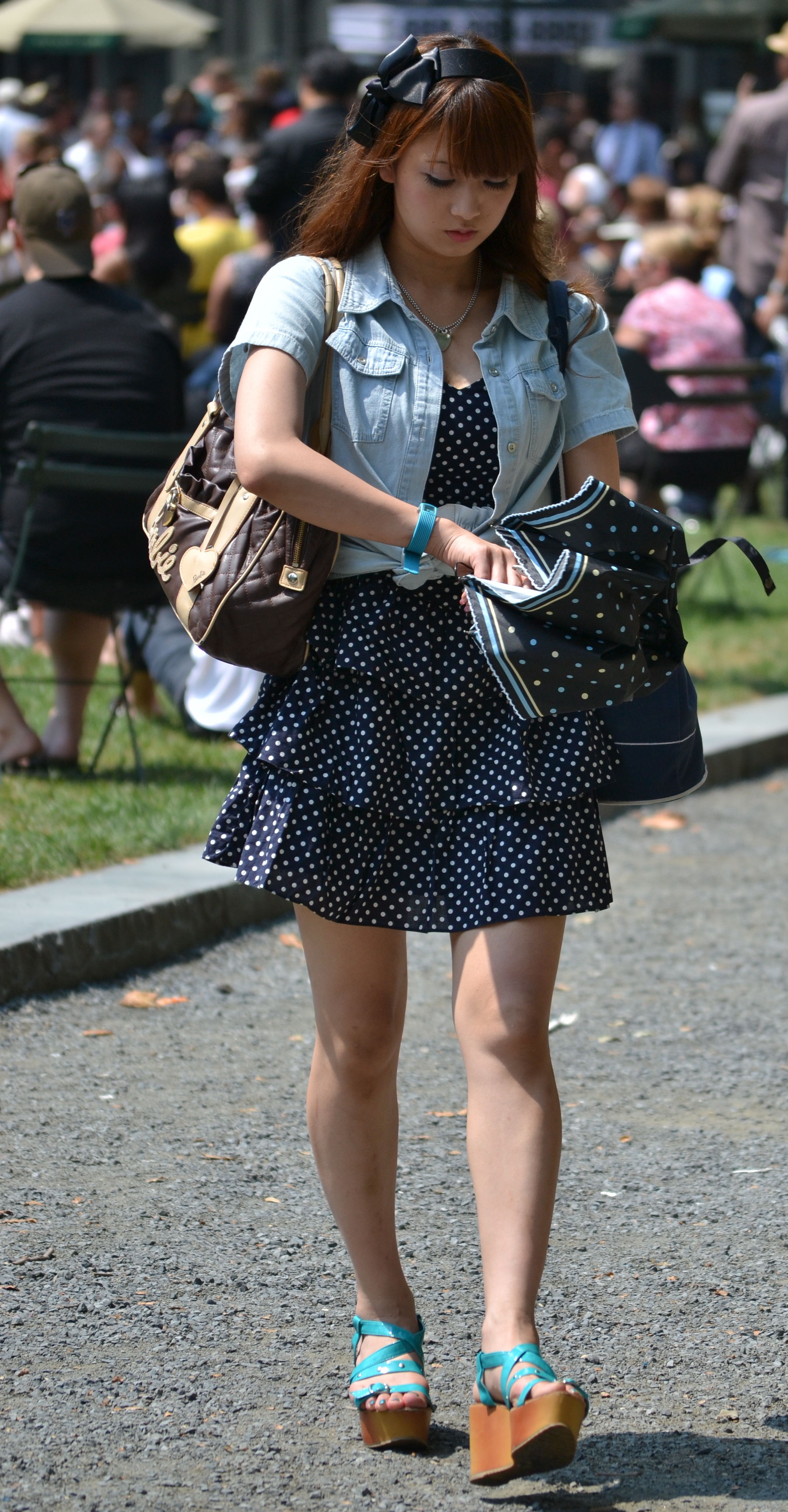 Diane Von Furstenberg has taken the colorblocking trend of the past seasons and incorporated it into her iconic line of dresses. The Aina dress is perfect for the fashion forward business woman. Its solid black body ends mid-thigh, long enough to be professional, short enough to be flirty. The grey stripe across the bust line is a buffer between the strong black and bold fuchsia shoulders and long sleeves. This young woman pairs this dress with a Louis Vuitton Bowler bag. The white color helps the bag stand out from the dress without taking away from the pop of the fuchsia.