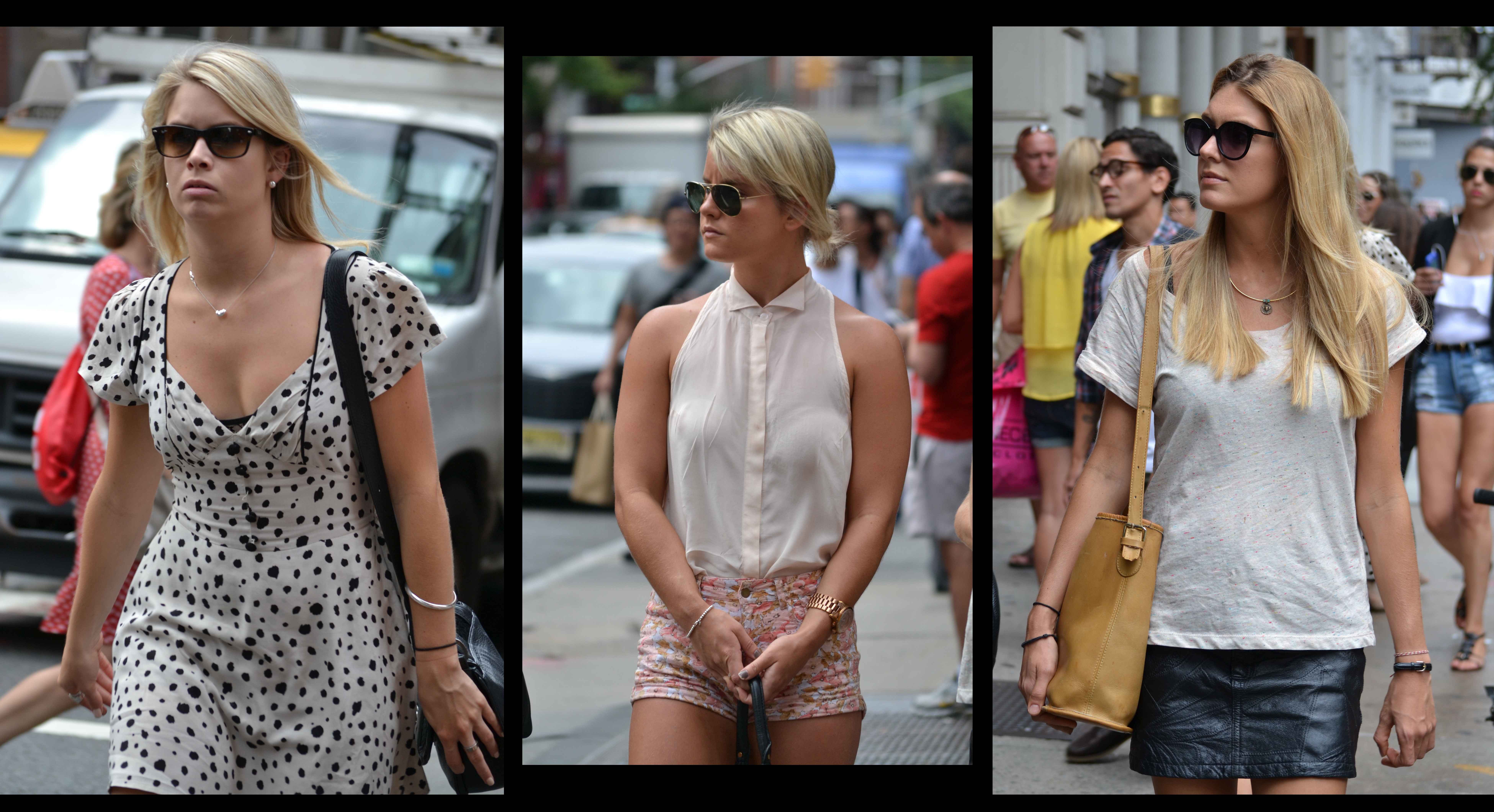 Well-dressed women often spend time with other well-dressed women, and this is proof. These three young ladies spent their afternoon walking visiting the shops of SoHo. While they are all blonde and wearing sunglasses, those are the only similarities in their looks.