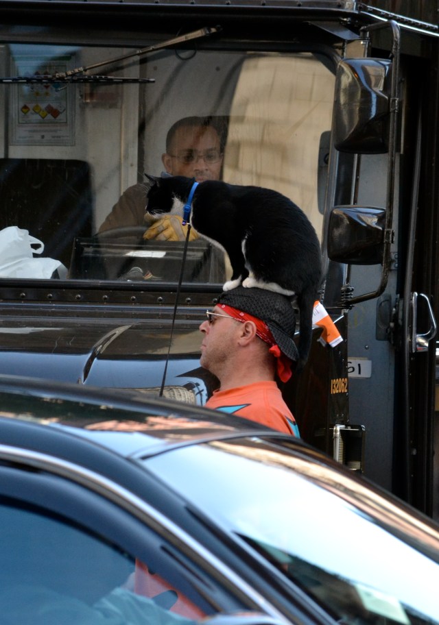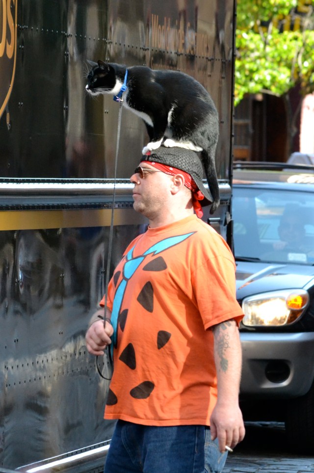 This post is not as much about fashion as it is about character. While I do really like the white ruffled shirt, bow tie and cumber bun combination, it is this man’s character and style that dominate the images. He looks like a writer, which could be the reason why I associated him with Mark Twain or maybe just because he looks like him. His worn leather bag looks like it could be holding a manuscript for the next great American novel. I do also like how the the beige jacket (occupy button on lapel, and all) stands away from the white shirt creating a little contrast in the outfit.