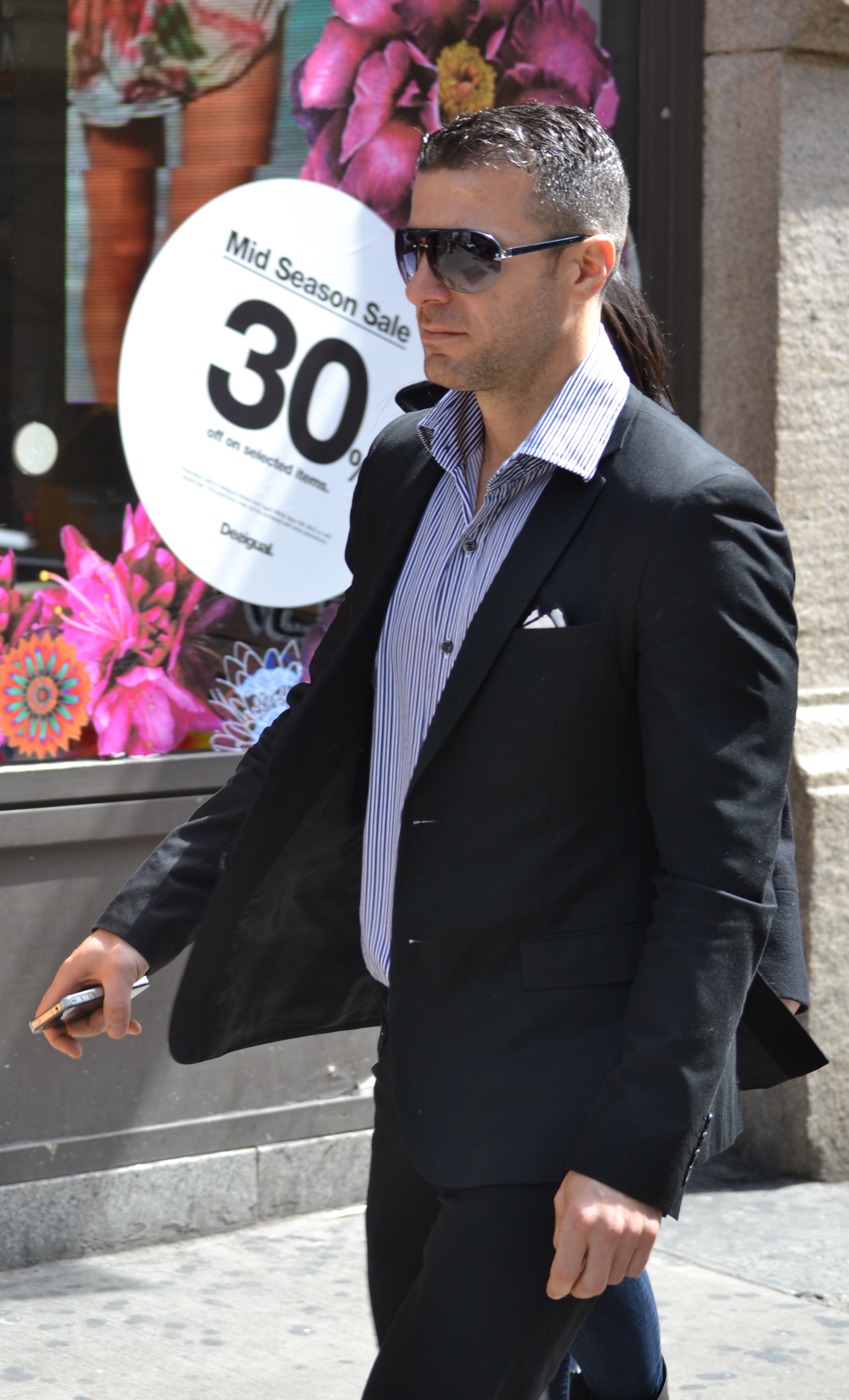 The all black outfit was out in full force today. This lady apparently got the memo, but wanted to stray a little. Her black leggings are tucked into her black, slouch cowboy boots. Her handbag, other than its silver studs is made completely of black leather. However, we are able to catch a peak of her grey sweater, hidden beneath her fringed, black poncho. The black poncho does work well as a contrast, as her blonde hair cascades over her shoulders.