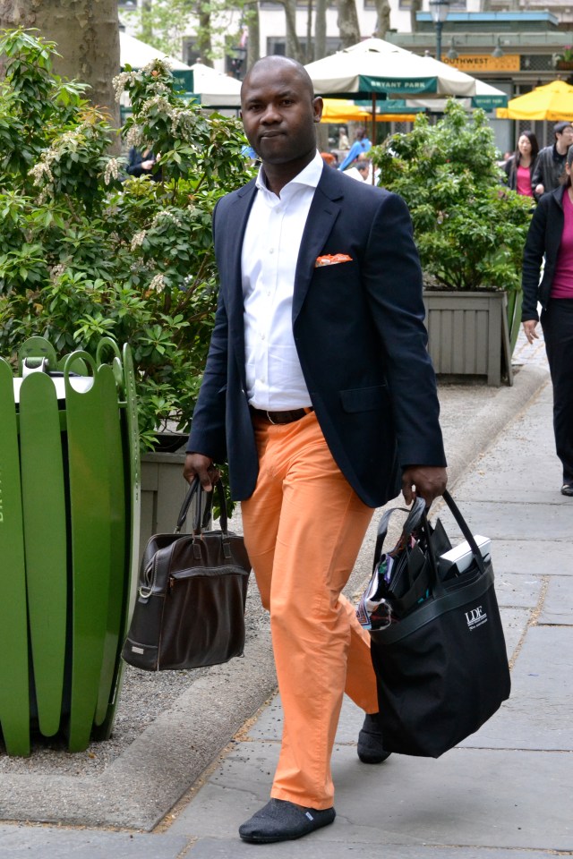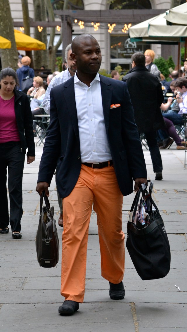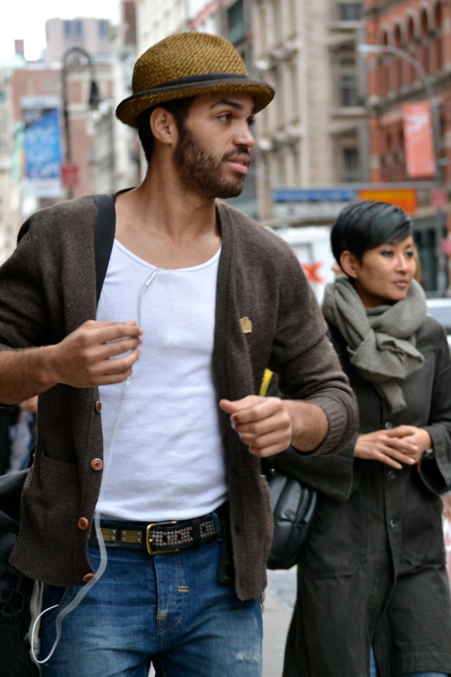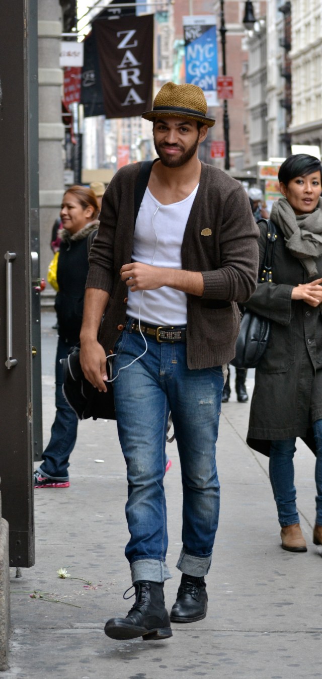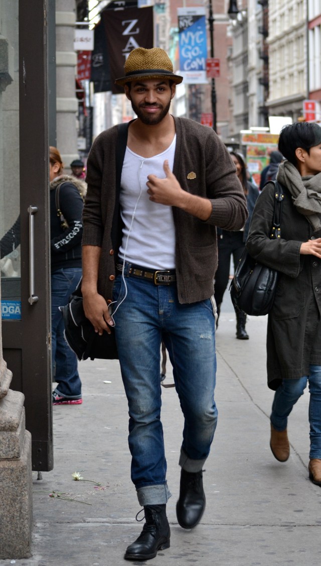 This young man walks the SoHo streets casually. He has a simple outfit that works very well for the downtown scene. His straight leg jeans, with a few rips, are cuffed, showing off his black military boots. A simple white, scoop neck t-shirt is a crisp, yet casual item. The faded brown cardigan helps continue the laid-back motif, and helps to keep him warm. The straw trilby hat is a nice finishing touch.