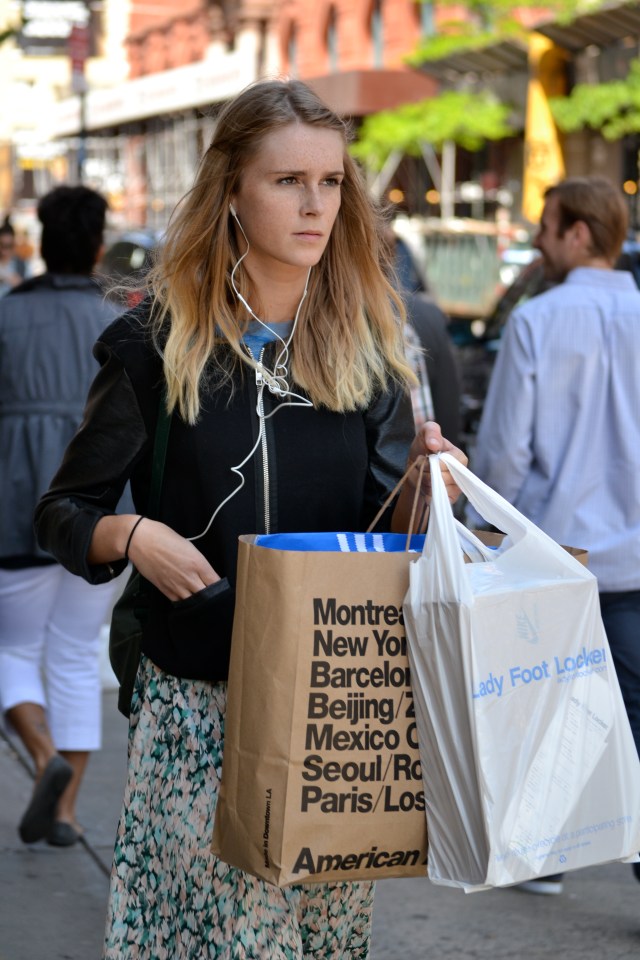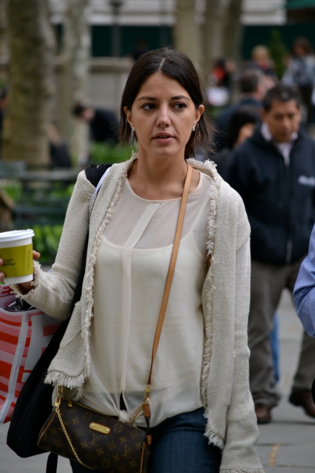 This lady in Bryant Park has great style. Her sweater, sheer blouse and spaghetti string tank all match, creating a subtle layered look. Her Tory Burch shoes are pretty great as well.