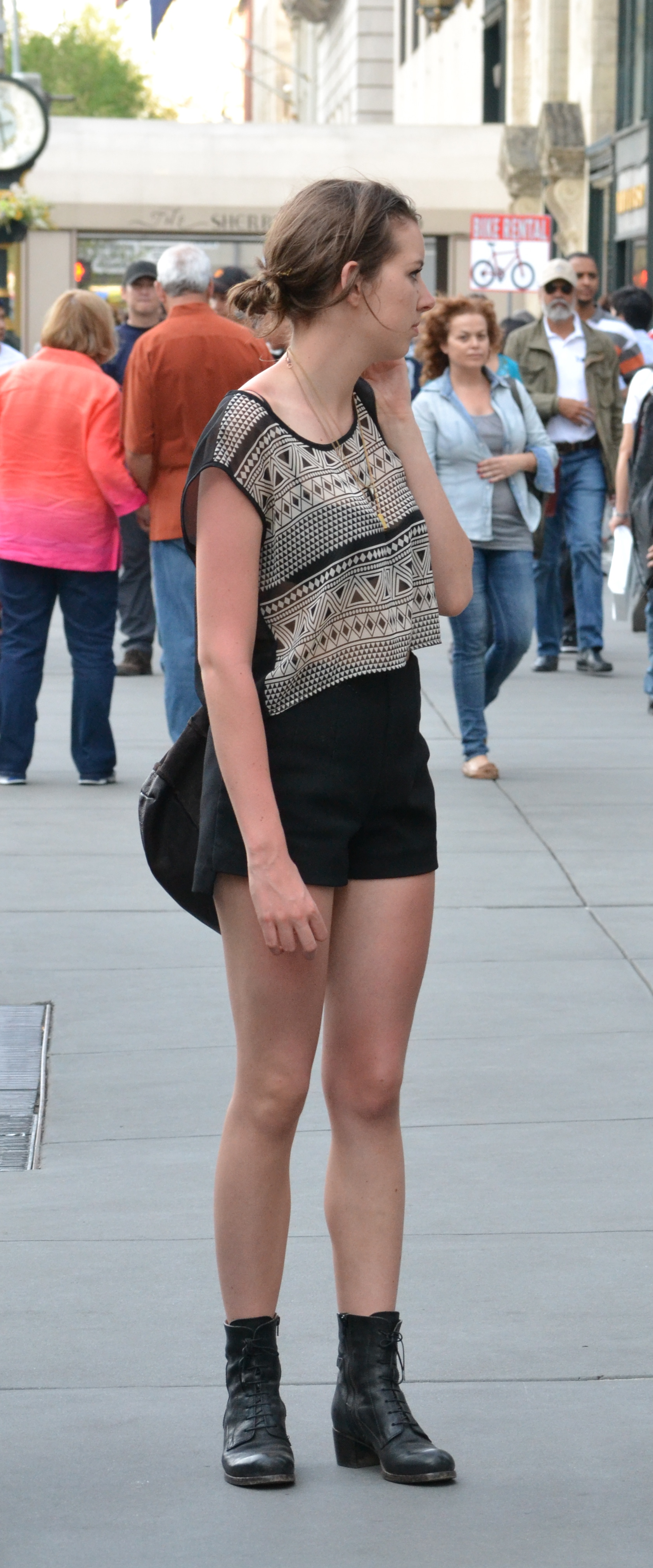 This young woman wins the prize for the best sheer top. A black and white, sleeveless, sheer bowling shirt. I really like the pockets, and how they match the spaghetti strap tank she has underneath.