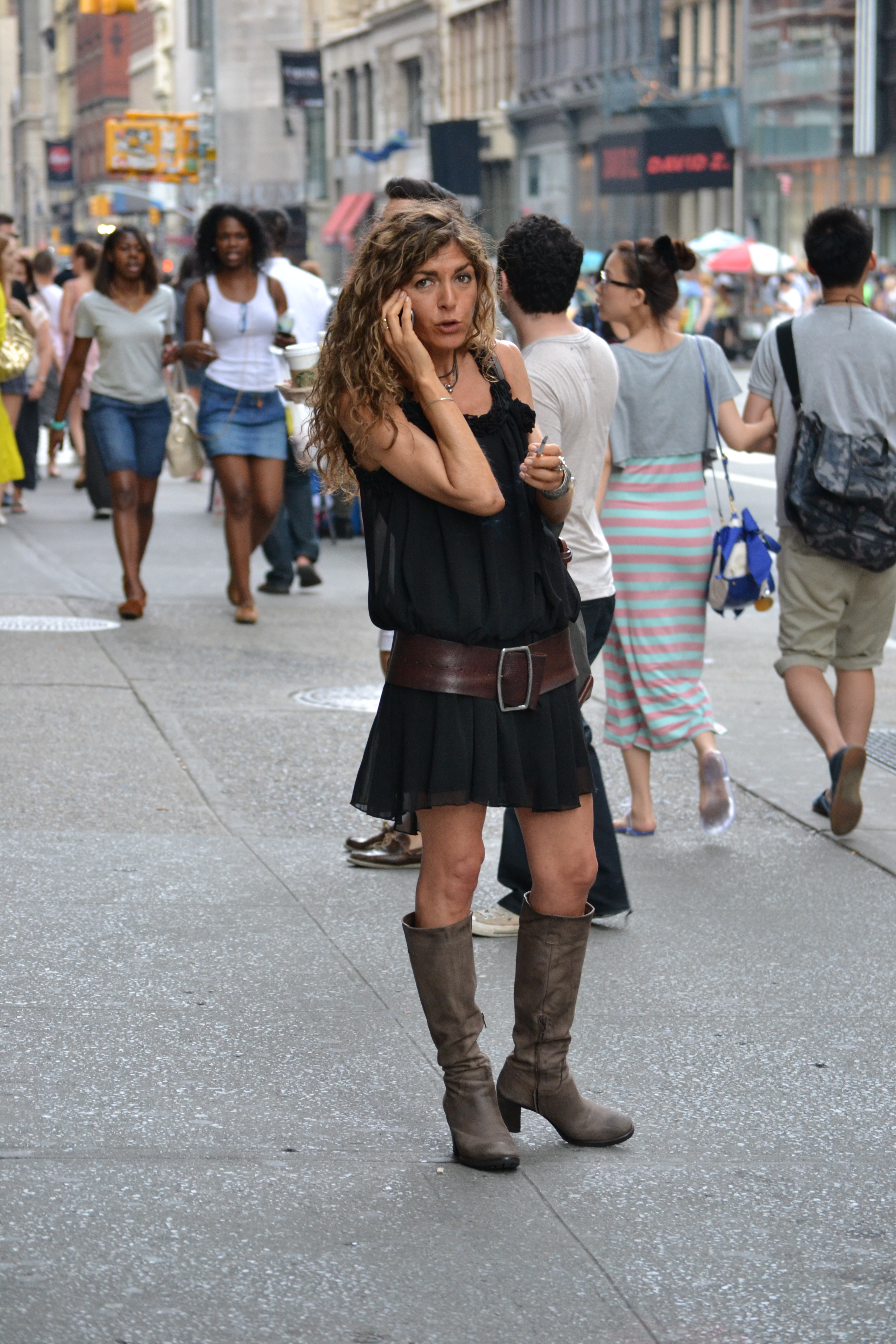 They say the older you get, the wiser you become; I guess the same goes for style as well. This woman may be high in years, but can be a standout in a group of 20-somethings any day of the week. Her style is more refined, but stylish just the same. The black, floppy brimmed sun visor sits underneath her wavy strawberry blonde locks, protecting her face from those damaging UV rays. The white button down shirt is finely pressed and the sleeves are perfectly cuffed creating a relaxed and more open feel. The thin scarf around her neck adds a little design to the plain white background, as well as a little touch of color. The olive drab, ankle length jeans, held up with a bold orange belt, leave enough room for her beige, wedge sandals to stand out. The pink pedicure adds youth and another pop of color to this outfit.